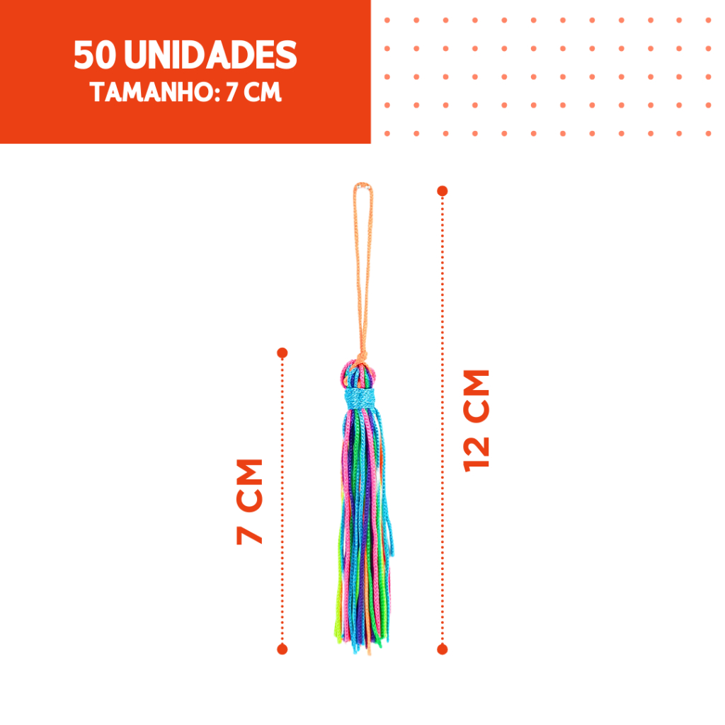Seja Bem Vindo a Loja NYBC - A Maior Empresa de Armarinhos e Aviamentos do Brasil Avisos e informações: - Envio direto de São Paulo! - Produto pronto para entrega - Envio Rápido! ATENÇÃO: ESSE ANUNCIO POSSUI MAIS VARIAÇÕES! Esse anúncio contém: - Pingente de Seda Tassel - Franja - Quantidade: 50 unidades - Tamanho: 7,5 cm - Composição: Poliéster Ideal para acabamentos enfeites, decoração, roupas e artesanatos em geral. Imagem Ilustrativa podendo sofrer variações de cor ou tamanho conforme configuração de tela ou monitor. Mais modelos e produtos: https://shopee.com.br/lojanybc