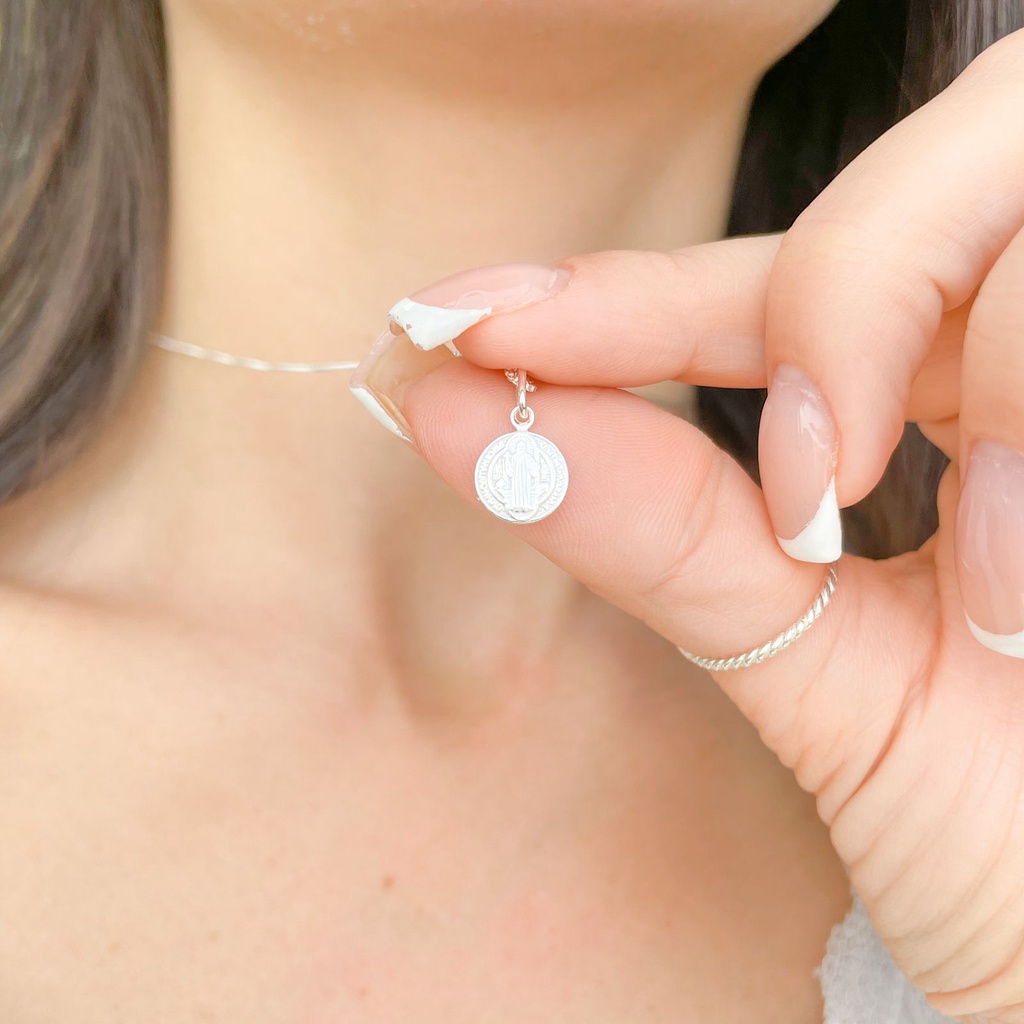 Pingente medalha de São Bento, frente e verso. Medalha: 8 mm de diâmetro Confeccionado em Prata 925 Garantia: 30 dias para defeitos de fabricação, contados a partir do recebimento. Itens que acompanham a peça: Certificado de garantia e saquinho de veludo. Sobre nós: A Ravenalla é uma loja online de acessórios confeccionados em prata 925. Trabalhamos com peças de qualidade, feitas e embaladas com muito carinho para levar até você uma experiência única. - Pronta entrega - Prata legítima de lei - Garantia para qualquer defeito de fabricação Dúvidas frequentes: 1 – As peças são folheadas? Não. Todas as nossas peças são de prata 925. 2 – Tem garantia? A garantia cobre defeitos de fabricação, porém não cobre avarias decorrente do uso. Caso a peça esteja com defeito você pode solicitar a troca ou devolução dentro do prazo de 30 dias. 3 – As peças podem escurecer? Sim. A prata é um metal com sensibilidade as reações químicas, o que acaba influenciando no seu escurecimento. Essa reação é completamente natural da prata e pode ser facilmente solucionado com produtos próprios.