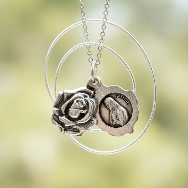 Pingente Medalha Flor Rosa – Nossa Senhora ou São Miguel Um pingente delicado e cheio de significado! Este lindo pingente em formato de rosa se abre para revelar no seu interior a imagem de Nossa Senhora (Fátima, Aparecida ou das Graças) ou São Miguel Arcanjo — escolha de acordo com a sua devoção. Uma joia simbólica, que une beleza e espiritualidade, perfeita para usar no dia a dia ou presentear alguém especial. 🔹 Material: Níquel 🔹 Tamanho: 2 cm 🔹 Abertura: A rosa se abre e fecha, revelando a medalha no interior 🔹 Opções de imagem: Nossa Senhora de Fátima, Aparecida, das Graças ou São Miguel Arcanjo Carregue consigo a força da fé e a proteção do céu, guardada com carinho no coração de uma flor.