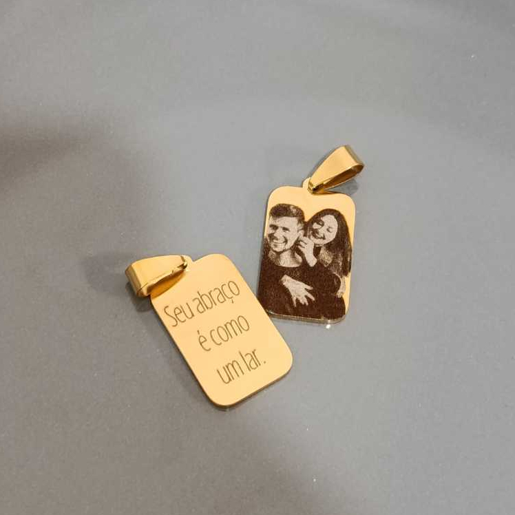 Pingente Placa Retangular Pequeno Personalizado – Aço Inox Dourada Transforme momentos especiais em um acessório único com o nosso Pingente Placa Retangular Pequeno Personalizado, disponível na cor Dourado. Feito em aço inoxidável de alta qualidade, este pingente oferece durabilidade e brilho duradouro, além de ser resistente à água e ao desgaste. Com medidas de 25 mm de altura por 15 mm de largura, ele é compacto, elegante e perfeito para o uso diário. O grande diferencial? Você pode personalizar o pingente com uma frase, nome, data ou foto – criando um item exclusivo que carrega sentimentos e memórias. ✨ Personalização exclusiva com gravação a laser ✨ Material: Aço inoxidável – resistente e durável ✨ Cores disponíveis: Dourado ✨ Tamanho do pingente: 25 mm x 15 mm Perfeito para presentear alguém especial ou carregar consigo algo que tenha significado. Seu toque pessoal faz toda a diferença! 🔧 COMO FUNCIONA? Tenha a foto e/ou frase que deseja gravar em mãos. Após a compra, envie a foto e/ou frase pelo chat para darmos início à personalização.