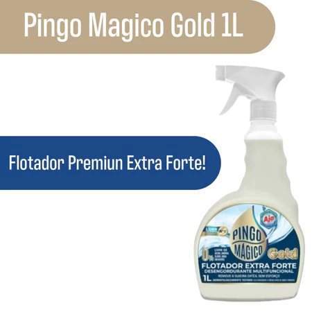 Pingo Mágico Gold Flotador Desengordurante Premium Extra Forte - 1L **ENVIO EM ATE 24H APÓS A CONFIRMACAO DO PAGAMENTO** **SELECIONAR NA VARIACAO A OPCAO DESEJADA** PINGO MÁGICO GOLD foi desenvolvido para efetuar limpeza profunda em superfícies fixas em geral, com alta eficiência. A perfeita combinação dos componentes de sua fórmula permite a dispersão das partículas de sujeira das superfícies, facilitando a remoção dos resíduos. Limpa instantaneamente e sem esforço superfícies com resíduos de óleo, gordura, graxa, fuligem, cera, batom, mofo, poeira, resíduos orgânicos, manchas de dedo e de pisoteamentos em superfícies. Aplicações: Fogão/cooktop, Grelha, Churrasqueira, Exaustor, Forno, Panelas, Formas de alumínio, Air Fryer, Micro-ondas, Coifa, Box de banheiro, Tapetes, Carpetes, Estofados, Azulejos, Pisos em geral, Forro de PVC, Carros e motores, Parede, Porcelanatos, Toldos, Fachadas, Mobiliários em fórmica, Granito, Granilite, Mármore, Plástico, Acrílico, Vinil, Couro, Vidro e superfícies em geral. INSTRUÇÕES DE USO: para limpeza de áreas com sujidades mais intensas, usar o produto 1:1. Para sujidades mais leves, diluir 1 parte do produto para até 5 partes de água (1:5). Em pisos e revestimentos, lavar com vassoura de pelo, nylon, fibra ou lavadora e enxaguar, ou passar pano levemente umedecido. Para limpeza de superfícies verticais, faça aplicação com pulverizador e em seguida aplique pano limpo e umedecido. Recomenda-se fazer teste em uma pequena área da superfície, assegurando a eficaz aplicação do produto. APÓS A UTILIZAÇÃO DO PRODUTO REMOVER DA SUPERFÍCIE COM UM PANO UMEDECIDO. RENDIMENTO: 1 litro de PINGO MAGICO GOLD limpa em média de 20 à 110m2. Qualquer dúvida entre em contato através do chat