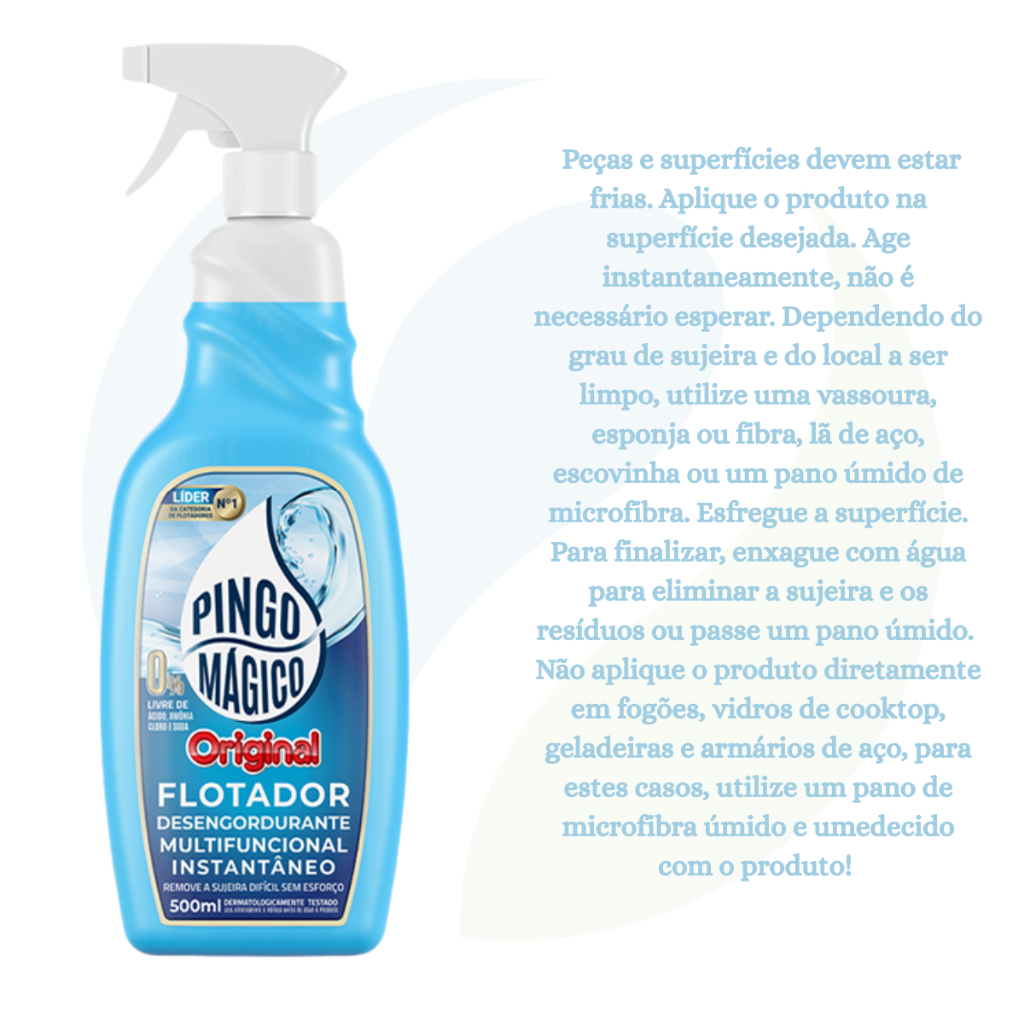 • Características do Produto: - Flotador multifunções, biodegradável e sustentável, de alta tecnologia, com SUPER poder de limpeza. Desenvolvido para efetuar uma limpeza instantânea, sem esforço e eficaz em qualquer superfície, sem nenhum tipo de agressão; - É indicado para a limpeza de: fogão, cooktop, grelhas, estofados, colchões, box de banheiro, vidros, pisos e porcelanatos, tapetes, carpetes, azulejos, rejunte, roupas, tênis, paredes, fachadas e toldos, motos e carros, entre outros; - Limpa instantaneamente e sem esforço, superfícies com resíduos de: gordura, limo, mofo, óleo, graxa, fuligem, cera, cola de adesivos, sujidades e odores de pets, mancha de suor na camisa, chiclete em roupas e sapatos e muito mais; - Apresenta um excelente custo/benefício. Sua fórmula concentrada é a única a ter eficácia comprovada e notificada no Ministério da Saúde (ANVISA); - Produto dermatologicamente testado. Não prejudica a pele nem as vias respiratórias. Livre de cloro, soda, amônia, ácido e solvente(alifático e aromático). Produto testado em laboratório específico, sem testes em animais. Desenvolvido à base de ingredientes naturais, pesquisa e tecnologia. Mais seguro, sustentável e eficaz.