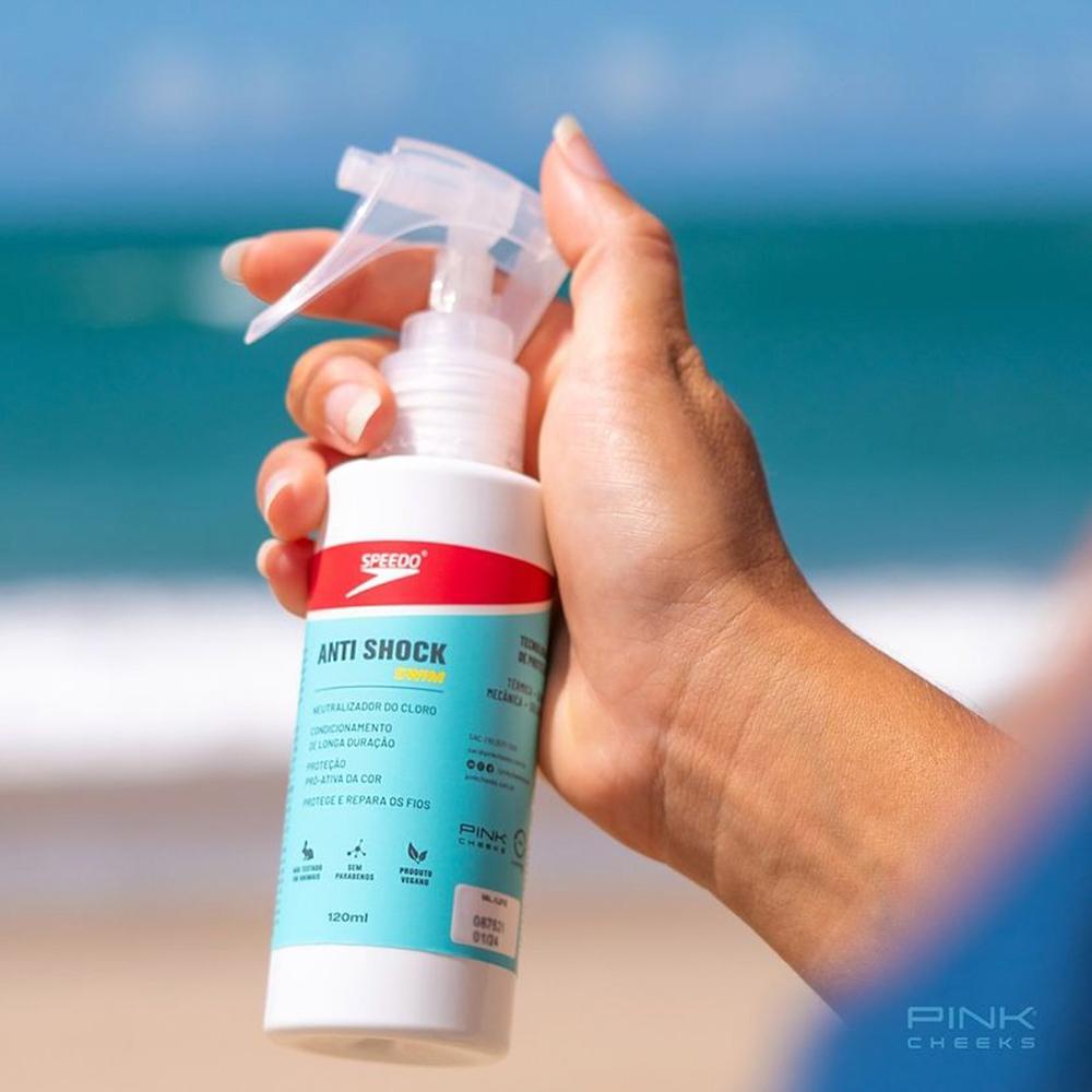 O leave-in spray Anti Shock Swim Speedo é um fluido capilar, com filtro solar, que alia 4 tecnologias de proteção: térmica, química, mecânica e solar UVA/UVB. Protege seus cabelos formando um filme ao redor dos fios, contra os danos causados pelo sol, água da piscina, do mar e calor do secador ou chapinha! * RESULTADO: Hidratação Reparação Resistência Multifuncional * SUGESTÕES DE USO: 1.Borrife o leave-in nos cabelos secos ou úmidos do comprimento às pontas antes de nadar. 2.Não enxague. 3.Após a aplicação, escove os fios. 4.Para um melhor resultado, reaplicar a cada 2 horas de permanência na água. * OBSERVAÇÕES: Imagem Meramente Ilustrativa * ITENS INCLUSOS: 1 Pink Cheeks Anti Shock Swim Speedo Leave-in Spray 120ml