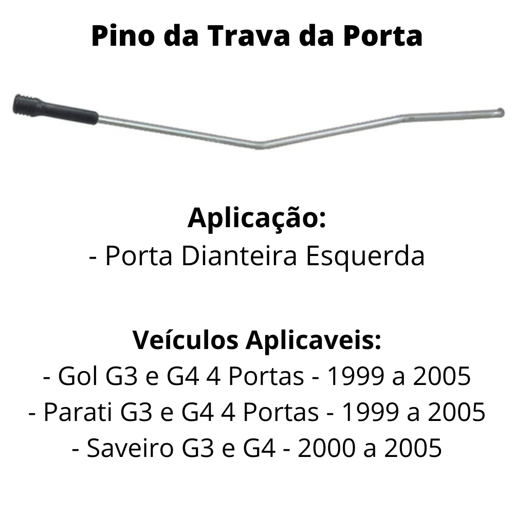 CONTEÚDO DA EMBALAGEM: - Pino Da Trava Da Porta Dianteira Esquerda Com Capa Roscada - Fechadura Magna VEÍCULOS APLICÁVEIS: - Gol G3 4 Portas - 1999 a 2005 - Gol G4 4 Portas - 2005 a 2014 - Parati G3 4 Portas - 1999 a 2005 - Parati G4 4 Portas - 2005 a 2014 - Saveiro G3 - 2000 a 2005 - Saveiro G4 - 2005 a 2009 IDENTIFICAÇÃO DO PRODUTO: - Marca: Universal - Código Universal do Produto (EAN): 7895272219822 - Código IPI: 87082999 - Código NCM: 8871 - SKU Universal: 21982