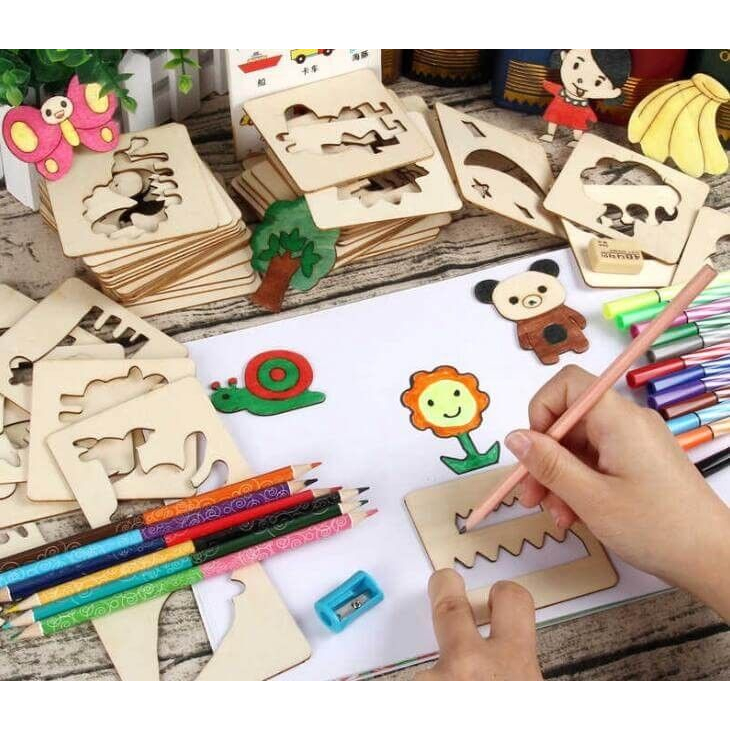 contém 5 peças moldes com desenhos sortidos molde de madeira com maior durabilidade produto muito bom para desenvolver cordenaçao motora Diversão e desenvolvimento em um só pacote atenção nao acompanha tintas só vendemos os moldes