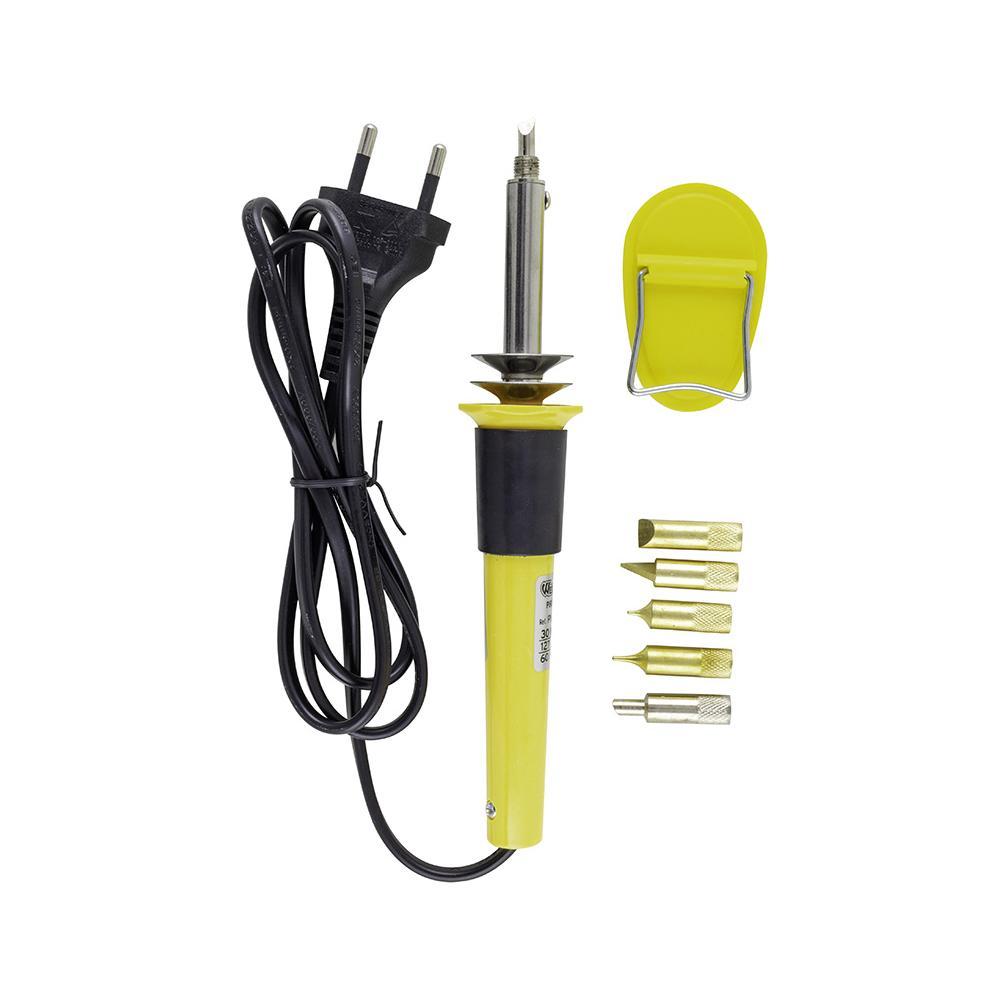 O Pirografo Ferro de Solda 30W 127V é a ferramenta perfeita para quem deseja explorar sua criatividade em trabalhos manuais como pintura em madeira, curvatura de couro, personalização de objetos e muito mais. Com 30 watts de potência, oferece um aquecimento rápido e eficaz, permitindo realizar traços detalhados e precisos em diversos materiais com facilidade. Com esse pirografo, você tem a liberdade para criar arte personalizada e trabalhos artesanais com precisão, elevando o nível de suas peças e projetos. Se você busca uma ferramenta confiável para suas atividades criativas, o Pirografo Ferro de Solda 30W 127V é a escolha certa PIRÓGRAFO E FERRO DE SOLDA 30W 127V - Dimensões da Peça: • Pirógrafo: 19 x 3 x 3cm • Comprimento do cabo: 112cm • Ponta formão: 2,7 x 0,8 x 0,8cm • Ponta curta: 2,8 x 0,8 x 0,8cm • Ponta longa: 3,2 x 0,8 x 0,8cm • Ponta faca: 3,2 x 0,8 x 0,8cm • Ponta soldador: 3,1 x 0,8 x 0,8cm • Apoio: 6,2 x 4 x 0,7cm - Dimensões da Embalagem: 13,3 x 3 x 26,5cm - Quantidade Inner: 12 Peças - Dimensões Inner: 41 x 28 x 14,5cm - Quantidade Master: 48 Peças - Dimensões Master: 57 x 43 x 30 - Material: Policarbonato, Policloreto de vinil, Aço inoxidável e Cobre - Cor: • Cabo: Amarelo com preto • Base: pode alterar • Pontas: Dourada - Tipo de Embalagem: Blister - Marca: Western - Origem: China - Contém 5 pontas: • Formão; • Curta; • Longa; • Faca; • Soldador; - Especificações: • Potência - 30 W. • Tensão - 127 V. • Frequência - 60 Hz. • Temperatura máxima - 400 °C. - Ideal para: • Fazer desenhos na madeira, e pode ser utilizado também como ferro de solda. • Ao utilizar um aparelho elétrico, algumas precauções básicas devem ser seguidas. • Para reduzir os riscos de incêndio, choque ou lesões, antes de utilizar a ferramenta, leia atentamente todas as instruções de uso e cuidados. • Antes de ligar a ferramenta na rede elétrica verifique se a tensão da rede é compatível com a ferramenta. - Atenção: • Risco de choque elétrico: • Nunca transporte o pirografo segurando pelo cordão de alimentação e nunca puxe o cordão de alimentação para desconectar o plugue da tomada. • Manter esta ferramenta fora do alcance das crianças - Para desenhar na madeira: • 1- Coloque a ponta desejada no pirografo e rosqueie. • 2- Limpe bem o local a ser desenhado. • 3- Solte sua imaginação e comece a desenhar. • 4- Para trocar a ponta, espere o pirografo esfriar totalmente antes de fazer a troca. - Para soldar: • 1- Coloque a ponta no ferro e rosqueie. • 2- Limpe as partes a serem soldados com um pano ou lixa comum, retirando as gorduras, graxas ou óxidos. • 3- Aqueça a peça a ser soldada, encostando a ponteira do ferro de solda a ela. • 4- Em seguida aplique a solda com núcleo de fluxo à ponteira aquecida, ligando as duas partes e prontamente soldando-as. Se utilizar solda comum, sem fluxo, as partes a serem soldadas devem ser besuntadas com pasta de solda apropriada. Espere a solda esfriar e endurecer antes de mover a parte soldada. • Atenção: esta ferramenta deve ser colocada em seu suporte quando não estiver em uso. - Cuidados: • Este aparelho não se destina á utilização por pessoas (inclusive crianças) com capacidades físicas, sensoriais ou mentais reduzidas, ou por pessoas com falta de experiência e conhecimento, a menos que tenham recebido instruções referentes à utilização do aparelho ou estejam sob a supervisão de uma pessoa responsável pela sua segurança. • Recomenda-se que as crianças sejam vigiadas para assegurar que elas não estejam brincando com o aparelho. • Se o cordão de alimentação está danificado, ele deve ser substituído pelo fabricante ou agente autorizado ou pessoa qualificada, a fim de evitar riscos. • Verifique a tensão do aparelho antes de usar, caso contrário poderá ocorrer incêndio causado pelo superaquecimento do aquecedor. • Utilize o pirografo com extremo cuidado, a alta temperatura do ferro pode causar acidentes ou fogo, se mal utilizado. • Os pirografo funcionam a altas temperaturas. Não toque no bico e na resistência enquanto a unidade estiver ligada. • Coloque o plugue completamente na tomada ao usar. Retire-o da tomada quando não estiver em uso ou antes de fazer alguma manutenção ou limpeza. • A duração da ponta de aquecimento será comprometida caso for puxada para fora e usado. • Após terminar o trabalho, retire-a da tomada e deixe esfriar naturalmente. • Não utilize o pirografo em local muito úmido, com as mãos molhadas ou na presença de água, evitando choques elétricos. Nunca deixe a ferramenta sem vigilância. • Para soldar, recomenda-se o uso do ferro de solda com potência apropriada para a soldagem que pretende fazer. • O uso de ácidos no lugar de solda com fluxo ou pasta é desaconselhável. • Não utilize o pirografo próximo a materiais inflamáveis para evitar incêndio. Nunca lixe a ponta do pirografo ou limpe com materiais abrasivos. • Utilize suporte do pirografo e outros cuidados para evitar incêndios e queimaduras. • Encaixe as peças corretamente e certifique-se de ter encaixa