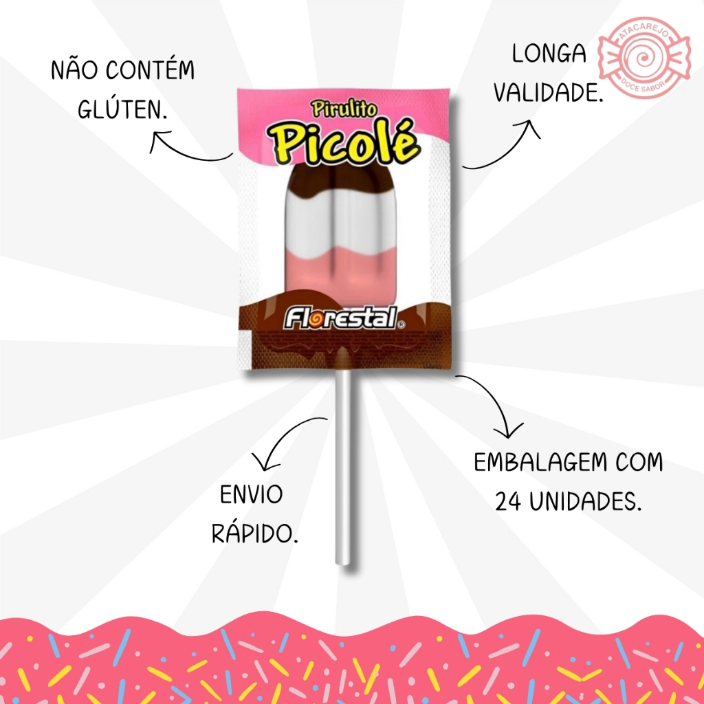 Pirulitos em formato de picolé e sabor napolitano. Perfeito para usar em decorações de mesas de festas, compor lembrancinhas de aniversário, tornando tudo mais colorido, com um toque único e especial! Medida aproximadas do pirulito: 2,5cm de largura x 9,7 de altura total (considerando o cabo). Embalagem de 550g contendo aproximadamente 50 unidades. Ingredientes: Açúcar, xarope de glicose, leite condensado, manteiga, gordura vegetal hidrogenada, sal, aromatizante, corantes dióxido de titânio e caramelo IV, emulsificante, lecitina de soja, corante artificial vermelho 40. NÃO CONTÉM GLÚTEN. CONTÉM LACTOSE. ALÉRGICOS: CONTÉM DERIVADOS DE LEITE E SOJA. Nossa loja, Doce Sabor, oferece envio rápido, produtos de qualidade e embalagens seguras. Aqui você encontra doces, artigos para festas e tudo para tornar sua celebração ainda mais doce!
