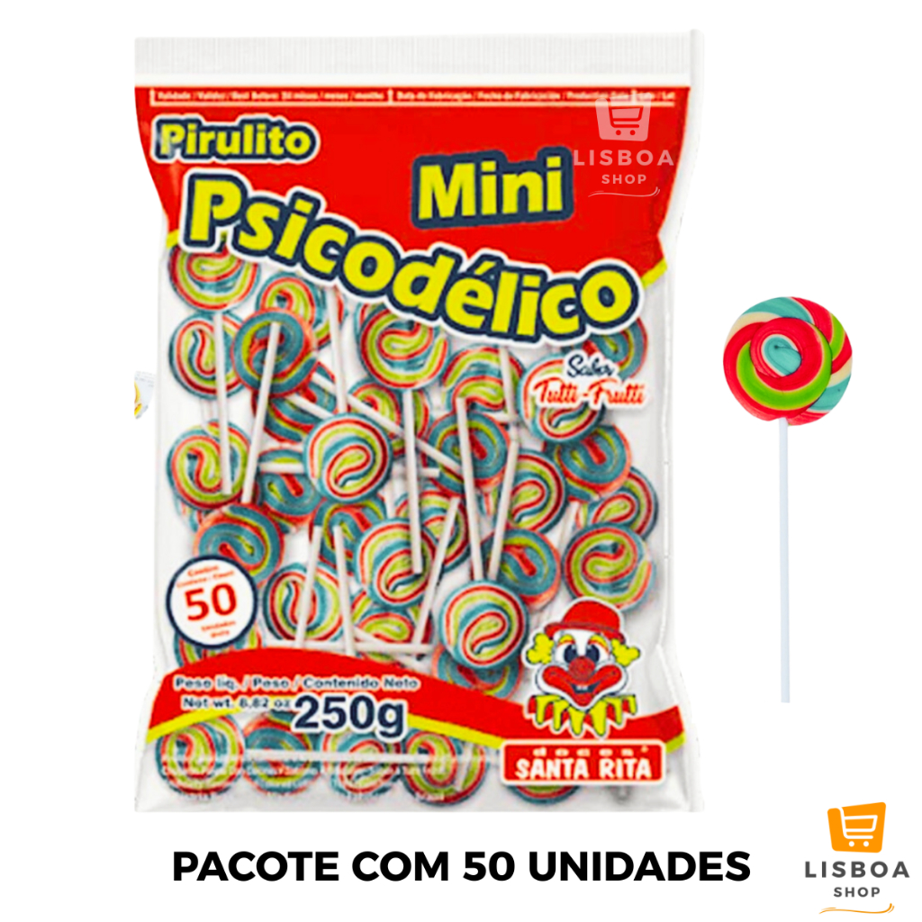 Pirulito Psicodélico Colorido Mini 250g com 50 unidades cada pacote - Santa Rita Deixe a diversão tomar conta da sua festa com esse clássico que encanta crianças e adultos! O mini pirulito psicodélico é delicioso e perfeito para transformar qualquer ocasião em um momento especial, ideal para lembrancinhas e sacolinha surpresa de festas e aniversários! CARACTERÍSTICAS DO PRODUTO: Marca: Santa Rita Peso: 250gr Sabor: Tutti Frutti Cores: Vermelho (Colorido), Azul e Rosa Todos tem os mesmo sabor de Tutti Frutti só muda as cores Medida aproximadas do pirulito: 3 cm de diâmetro + 6 cm cabo = 9 cm altura total (considerando o cabo) Cada pacote de 250g contém 50 unidades ITENS INCLUSO: 3 Pacotes De Pirulito Psicodélico 250g c/50 unidades cada PRAZO DE VALIDADE Pacotes tem no mínimo 8 meses de validade a partir do momento da compra. ---------------------------------------------------------------------------------------- DÚVIDAS FREQUENTES Qual o prazo de envio e postagem do produto? Assim que seu pagamento for confirmado enviamos todos os produtos dentro de um prazo de 24 horas, pedidos realizados aos sábados, domingos e feriados enviaremos no próximo dia útil. Prazo de entrega? Normalmente chegam os pedidos nas datas corretas que são disponibilizadas no calculador de frete. Mais informações sobre prazo de validade? Consulte-nos no chat Tipo de embalagens? Todos nossos produtos são muito bem embalados com carinho e cuidado para não chegarem danificados, não se preocupe. As mercadorias possuem nota fiscal? Sim, todos nossos produtos são vendidos com nota Fiscal. ---------------------------------------------------------------------------------------- Caso tenha mais algumas dúvidas, entre em contato pelo chat, que estamos à disposição será um enorme prazer te atender !