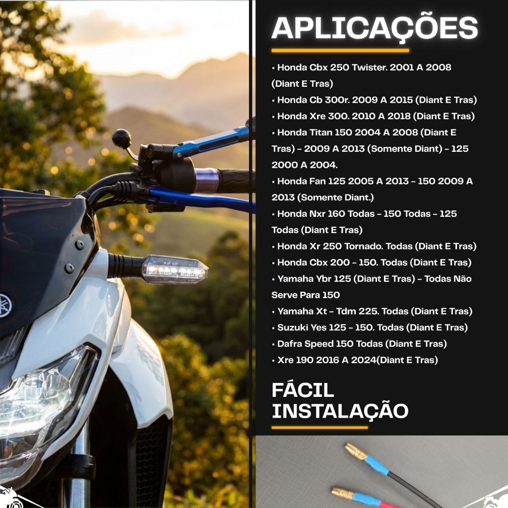Pisca Led Seta Parafuso Cbx 250 Twister Nxr Titan Fan 125 150 Ybr 125 Xre 190 APLICAÇÕES: • Honda Cbx 250 Twister. 2001 A 2008 (Diant E Tras) • Honda Cb 300r. 2009 A 2015 (Diant E Tras) • Honda Xre 300. 2010 A 2018 (Diant E Tras) • Honda Titan 150 2004 A 2008 (Diant E Tras) - 2009 A 2013 (Somente Diant) - 125 2000 A 2004. • Honda Fan 125 2005 A 2013 - 150 2009 A 2013 (Somente Diant.) • Honda Nxr 160 Todas - 150 Todas - 125 Todas (Diant E Tras) • Honda Xr 250 Tornado. Todas (Diant E Tras) • Honda Cbx 200 - 150. Todas (Diant E Tras) • Yamaha Ybr 125 (Diant E Tras) - Todas (Não Serve Para 150 ) • Yamaha Xt - Tdm 225. Todas (Diant E Tras) • Suzuki Yes 125 - 150. Todas (Diant E Tras) • Dafra Speed 150 Todas (Diant E Tras) • Xre 190 2016 A 2024(Diant E Tras) ESPECIFICAÇÕES: • COR DOS LEDS: laranja; • COR DA LENTE: cristal; • 12v 1w. CONTEÚDO EMBALAGEM: • 1x Unidade de Pisca VANTAGENS: • Aplicável em qualquer lado dependendo do modelo(Encaixe de Parafuso/Rosca) • Não acumula água • Ótimo acabamento • Economiza energia e ilumina mais """""!!!!!!!!!! NÃO ACOMPANHA RELÊ PARA ADAPTAÇÃO !!!!!!!!!!""""" CASO A MOTO NÃO VENHA COM PISCA DE LED ORIGINAL, DEVERÁ SER INSTALADO UM RELÊ DE LED! !!!!!!!!!!!!!!! IMAGENS MERAMENTE ILUSTRATIVAS !!!!!!!!!!!!!!! SOBRE NOSSA EMPRESA: Somos uma organização com anos de experiência no mercado. Seja você um apaixonado por velocidade, um aventureiro de estrada ou um entusiasta da personalização, cumprimos a missão de fornecer peças e acessórios da mais alta qualidade para elevar sua experiência de pilotagem a um novo patamar. UTILIZE O CAMPO DE PERGUNTAS PARA TIRAR SUAS DÚVIDAS, e apenas confirme a compra em caso de CERTEZA de compatibilidade do produto! CÓDIGO: COD_16929