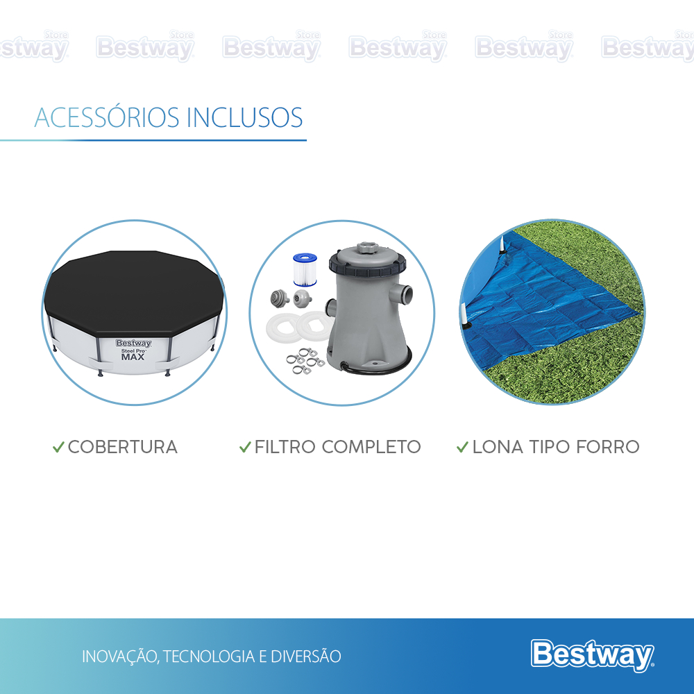 Você está comprando um produto Bestway original, da Bestway Store, sua loja oficial no Brasil! Quem somos: Há mais de 28 anos, a Bestway foi fundada com uma visão clara: criar diversão e experiências memoráveis para todos por meio dos produtos e serviços que oferecemos. Estamos presentes em todo o MUNDO, incluindo os Estados Unidos, França, Itália, Alemanha, Austrália, China e em mais de 120 PAÍSES, com a operação de seis fábricas próprias. Continuamos comprometidos com a qualidade e a inovação em todos os nossos produtos, mantendo-nos constantemente atualizados e acompanhando o que há de novo. >>> Aproximadamente 1 dentre 50 pessoas em todo o mundo possui um produto Bestway! Construção Robusta e Duradoura A estrutura da piscina é feita com aço resistente à corrosão, garantindo estabilidade e longevidade. As juntas FrameLink evitam o contato entre metais, prevenindo a ferrugem. O revestimento Tritech de três camadas é super-resistente a furos e rasgos, sendo significativamente mais robusto que o PVC padrão, o que significa que sua piscina vai durar por muitos verões. Acessórios Essenciais Inclusos: Para sua comodidade, a piscina vem completa com tudo que você precisa para começar a usar. Isso inclui uma bomba filtrante que mantém a água sempre cristalina, uma capa de proteção para quando a piscina não estiver em uso e um forro para o chão, que oferece uma camada extra de proteção e conforto. Montar e desmontar é muito simples, sem a necessidade de ferramentas, e a drenagem da água é rápida e fácil graças à válvula de controle de fluxo embutida. Prepare-se para refrescar seus dias e criar memórias inesquecíveis com a piscina Bestway Steel Pro MAX! Especificações: - Capacidade de Água (90%): 4.678 L - Tamanho da Piscina: 3.05 m x 76 cm - Tamanho da capa: 3,05 m de diâmetro - Tamanho do forro: 3,35 m x 3,35 m - Paredes laterais Tritech resistentes a perfurações e raios UV são confiáveis contra o peso, tensão e movimento. - Faixa de 3 camadas oferece suporte adicional à parede. - Estrutura de aço resistente à corrosão com acabamento fosco; - Juntas FrameLink previnem danos de metal contra metal; - Montagem da estrutura e do revestimento leva 30 minutos com 2 a 3 pessoas. Revestimento interno com estampa Prismatic Stone; - Vazão de água da bomba (capacidade da bomba): 1.249 L/h. - Vazão de água do sistema de piscina integrado (vazão do sistema): 1.060 L/h. - Válvula de drenagem Conteúdo: - 1 Piscina Estrutural Bestway de 4,678L. - 1 Forro - 1 Capa de Cobertura - 1 Kit Reparo adesivo. - 1 Manual de uso da piscina. - 1 Filtro Para Piscina 1249L/hora Bestway 127V/220V (Selecione a voltagem) . - 1 Cartucho para filtro de 1249 L/h. Perguntas Frequentes: Qual a diferença entre a Piscina Azul Steel Pro e a Cinza Steel Pro Max? A Piscina Cinza Steel Pro Max representa um avanço significativo em termos de tecnologia e resistência. Sua estrutura robusta, reforçada com aço e um revestimento especial, oferece uma proteção superior contra as intempéries, garantindo uma vida útil prolongada. Em contraste, a Piscina Azul Steel Pro, embora seja uma excelente opção de entrada, não possui a mesma tecnologia e durabilidade que a versão Max. A Steel Pro Max é ideal para quem busca uma piscina com maior resistência e longevidade. Quantas pessoas cabem na piscina? Esta piscina tem 3,05m de diâmetro e permite de 4 a 6 pessoas a depender do biotipo e idade. QUAL A DIFERENÇA DE FILTRAR E ASPIRAR? Aspirar: esse processo auxilia a limpeza e retira toda a sujeira que se acumula no fundo da piscina. Filtrar: esse é um dos processos mais importantes, pois retira todas as impurezas insolúveis da água, como poeira e algas, por exemplo. São essas impurezas que deixam a água da piscina turva e imprópria para banho. Qual o material da estrutura? A estrutura é formada por aço e contém revestimento que o torna resistente ao processo de ferrugem. Qual o material da lona da piscina? A lona é composta por duas camadas de PVC e entre elas uma de Poliéster que proporcionam maior resistência. Posso usar produtos químicos? Sim, todas as Piscinas Bestway são adequadas para o tratamento da água com produtos químicos. Os principais produtos são cloro, algicida, clarificante. Mas há outros produtos que também podem ser usados. O que é preciso para manter a piscina limpa? Há uma série de produtos químicos que podem ser utilizados para manter a sua piscina limpa, os básicos são: fungicida, clarificante e o cloro. Algicida: O Algicida é um produto que tem por função prevenir e eliminar algas formadas nas paredes e no fundo da piscina e que podem deixá-la turva e esverdeada. Clarificante: É usado para manter a água cristalina e funciona como um agrupador de micropartículas que ficam na superfície da água, facilitando a aspiração pelo aspirador Bestway do Kit Limpeza para piscina 2 em 1. Cloro: É um dos produtos mais importantes e atua como desinfetante. Elimina os microrganismos presentes na água e impede a proliferação de bactérias qu