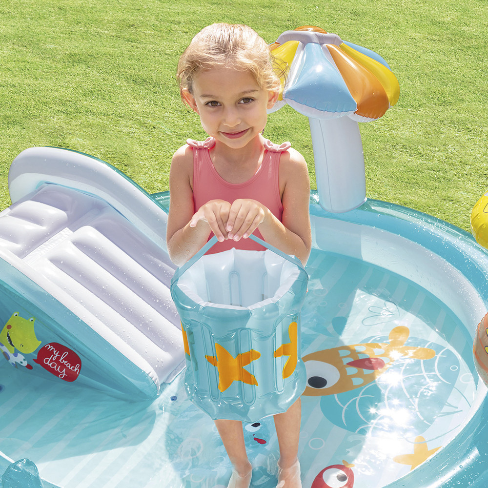 Piscina Infantil Playground Jacaré Esguicha Água Inflável 160 Litros - Intex Especificações: Piscina infantil multijogos com medidas 201 x 17 x 84 cm, suporta um peso máximo de 54 Kg e é recomendado para crianças maiores de 2 anos. Instalar em espaços exteriores como a terraço ou pátio. Incluso 1 escorrega com solo acolchoado, 1 crocodilo, 1 sombrinha em forma de cogumelo, 1 balde de pescar insuflável e 1 mini flutuador de patinho Com 1 pulverizador de crocodilo com entrada para mangueira do jardim e 1 tampa de drenagem para esvaziar a piscina Fabricada de PVC resistente de acabamento transparente, tem 13 câmaras de ar e inclui 1 remendo de reparação para pequenas perfurações. Garantia: 03 meses contra defeitos de fabricação. *Imagens meramente ilustrativas. *As cores podem variar conforme monitor/smartphone utilizados para a visualização do anúncio. *Objetos de decoração das fotos não estão inclusos.