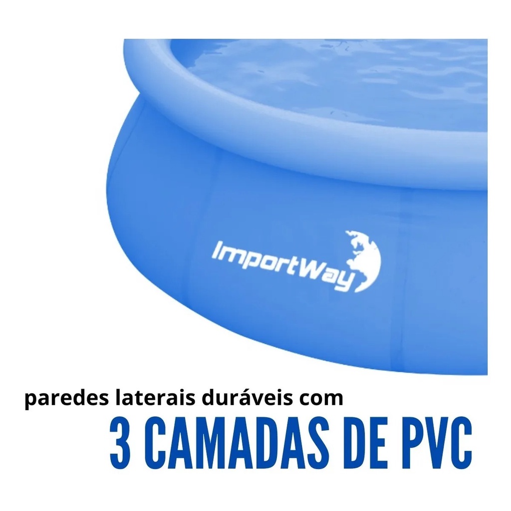 Piscina Borda Inflável Capacidade 4600 Litros Importway Fácil de montar, a piscina inflável da Importway é a melhor opção para se refrescar com a família e com os amigos nos finais de semana. Possui 3 camadas de PVC laminado de alta resistência, oferecendo uma excelente durabilidade. Especificações: *Marca: Importway *Modelo: IWPBI4600 *Piscina Inflável *Capacidade: 4600 Litros *Material: PVC *Fácil de Montar *Com Válvula de Drenagem *Acompanha Kit de Reparação *Altura: 76cm *Diâmetro: 3m Conteúdo da Embalagem: - 01 Piscina Borda Inflável Capacidade 4600 Litros Importway "Compra Garantida" - Ao Comprar conosco a sua compra é 100% garantida, o seu dinheiro está seguro até a entrega. *Garantia 90 dias. *Imagens meramente ilustrativas