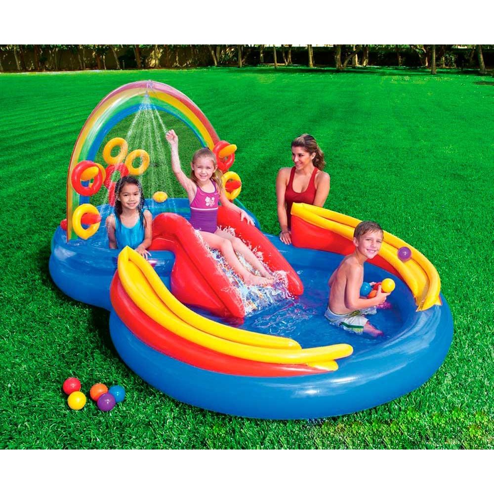 Piscina Playground Arco-Iris 246 Litros - Intex Faça com que a diversão dos mais novos se multiplique com este centro de jogos aquático inflável da Intex" A Piscina Playground Arco-Iris é um centro de jogo de água dividido em duas piscinas e que inclui diferentes acessórios para poder brincar com eles enquanto os pequenos dão um mergulho refrescante. Vem com borrifador de água, conecta-se à mangueira de jardim para manter as crianças refrescadas no verão, tem plugues de drenagem no fundo das piscinas, acompanha Kit de reparo e é muito fácil de inflar. Conta com um escorrega com base acolchoada para amortecer a queda e aros infláveis encaixáveis. Possui tampão de escoamento para facilitar ao encher e esvaziar. Com 6 bolas de polietileno branco e 4 aros infláveis para encaixar. Idade recomendada: Acima de 3 anos. Informações Técnicas: - Medidas: 297 x 193 x 135 cm - Capacidade: parte grande com 227L e pequena com 20L - Fabricada em vinil extra resistente