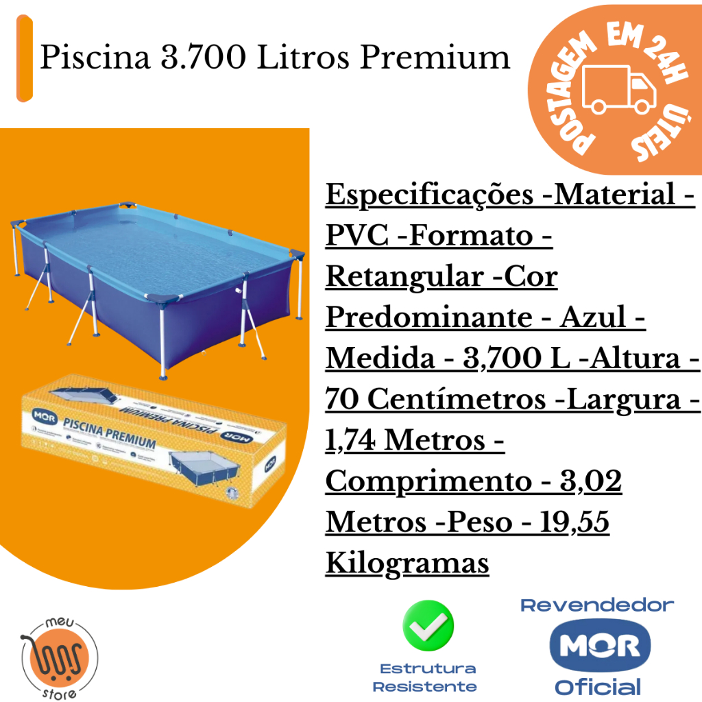 Piscina 3.700 Litros Premium PRODUTO ORIGINAL A PRONTA ENTREGA A Piscina Premium de 3.700 litros Mor tem detalhes únicos que vão proporcionar uma diversão segura para todos, sendo a melhor opção para quem quer curtir ao máximo os prazeres da água!Com estrutura resistente à fortes impactos, possui tripla camada: duas lâminas de PVC com uma trama de poliéster entre elas. Seus exclusivos esquineiros na cor azul garantem mais firmeza, facilidade ao montar e também um melhor acabamento. As escoras da Piscina são pintadas em epóxi à pó na cor branca, garantindo ainda mais durabilidade, além do design moderno e inovador. Tudo para proporcionar mais praticidade durante sua manutenção, deixando a hora do lazer muito mais tranquila e divertida.Possui ainda, válvula para encaixe de filtro e deságue de água. Perfeita para a família toda se reunir e brincar de montão na melhor época do ano! Atenção! Nunca deixe crianças sozinhas perto da água sem supervisão de um adulto. Especificações -Material - PVC Formato - Retangular Cor Predominante - Azul Medida - 3,700 L Altura - 70 Centímetros -Largura - 1,74 Metros -Comprimento - 3,02 Metros MEDIDAS COM AS ESCORAS: Altura 0,70 X 3,70m comprimento X 2,42 Largura Peso - 19,55 Kilogramas MOR Olá! Bem-vindos à MOR! Uma empresa brasileira, que tem como vocação criar soluções inovadoras e de qualidade aos seus consumidores. Nascida no município de Santa Cruz do Sul, a MOR começou como uma empresa familiar, que fabricava produtos para apicultura em uma pequena metalúrgica, no início dos anos 60. Ao longo dos seus 60 anos de história, a empresa cresceu e se consolidou no mercado de produtos para casa, camping e lazer. Hoje, esses produtos fazem parte da vida e história de muitos brasileiros, como as piscinas, cadeiras, churrasqueiras, varais, escadas, térmicos e isotérmicos. Totalizando um mix de mais de 1.600 códigos, divididos em 10 famílias de produtos.