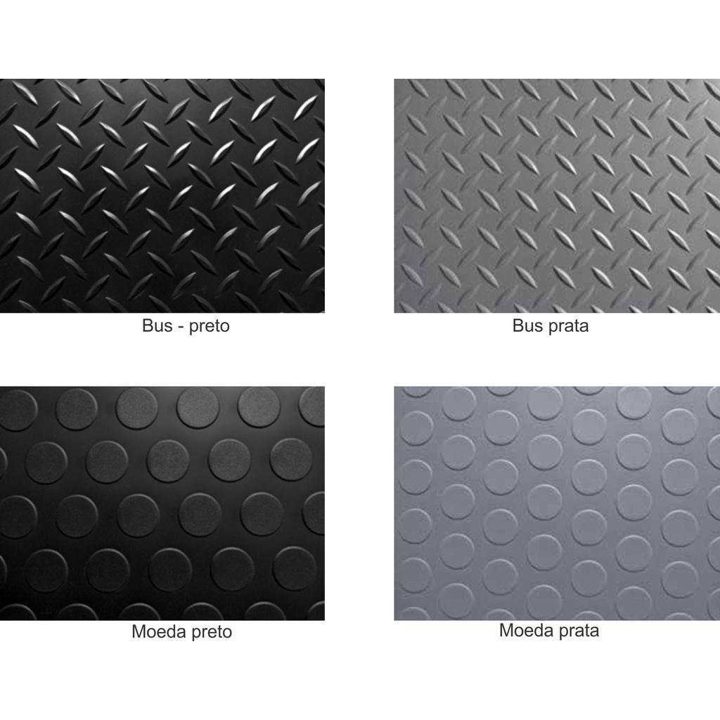 Piso emborrachado (vinílico de pvc) com relevo Moeda e Bus Medida: 0,50 x 2,00 Espessura: 1,00mm Escolha a Cor: PRETO E PRATA Escolha o Relevo: BUS ou MOEDA Apresentação e outras opções de medida: Em manta com 1mt ou 2mt de largura por até 25 metros de comprimento. ATENÇÃO! Antes de comprar leia atentamente o descritivo deste anúncio e se necessário tire suas dúvidas em “PERGUNTE AO VENDEDOR” localizado no final deste anúncio. Fique atento quanto a espessura, cor e demais características do produto. Piso com conforto térmico e acústico, antialérgico, resistente a umidade, . Confeccionado em material 100% sintético (pvc). Resistente a “alto trafego”, pode ser usado como piso definitivo (colado) ou como tapete ou sem colagem. Espessura: 1mm. Relevo: , formato de Moeda e Bus Resistência: Apresentam excelente resistência a abrasão e durabilidade. Peso por m²: 1,86 kg. Indicado para ambientes interno e externo, residencial e comercial. Espaços e ambientes indicados: Academia Garagem Oficina Terraço Automotivo (ônibus, vans, caçamba) Sala de festas Sala de jogos Playground Sala de aula Copa e cozinha Eventos A INSTALAÇÃO É MUITO SIMPLES CONTUDO É INDICADO O EMPREGO UM PROFISSIONAL QUE TENHA CONHECIMENTO COM INSTALAÇÃO DE PISO DE COLAGEM. SERÁ NECESSÁRIO COLA VINILICA OU COLA DE CONTATO NA BASE DE UM GALÃO DE 3,600ML PARA CADA 15M² E ESTILETE PARA OS RECORTES. OBS. NÃO VENDEMOS A COLA.