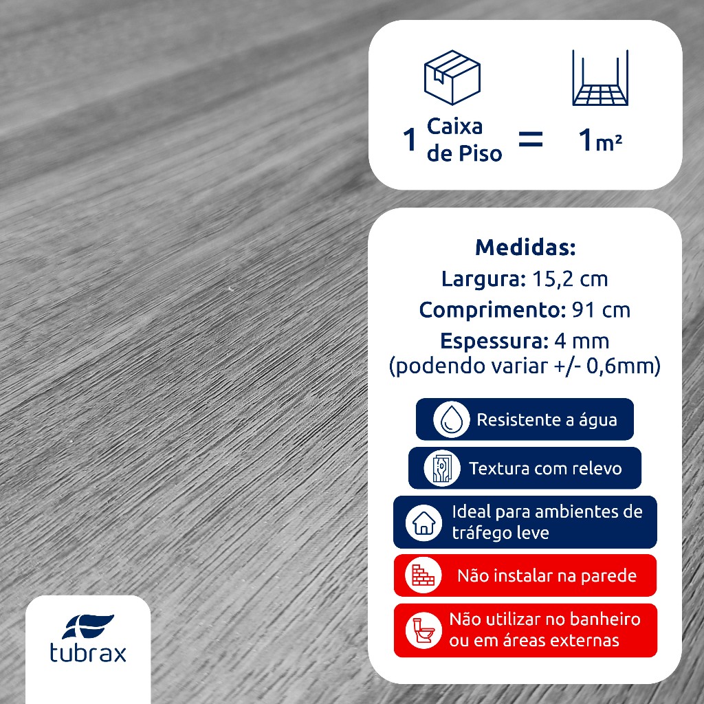 Os pisos vinílicos Tubrax são indicados para uso residencial de tráfego leve. A instalação deve ser realizada em um contrapiso nivelado. É possível aplicá-lo diretamente sobre pisos existentes, desde que não apresentem irregularidades. Caso haja irregularidades, recomendamos a aplicação de um material nivelante para garantir a correta instalação. Contra indicações: paredes, áreas externas e/ou que peguem chuva, ambientes que peguem alta incidência solar, alta umidade. Possui conforto térmico e acústico. É composto por PVC, um material plástico que garante maior durabilidade e é resistente à água. Para melhorar ainda mais não retém cheiro e não estufa. Aplicação clicada com sistema de encaixe (Macho e fêmea), o que garante um ótimo custo benefício, sem quebradeira nenhuma e sem aquela quantidade de poeira indesejada. Possui desenhos que se completam com características e tonalidades de madeira, oferecendo além de modernidade um toque aconchegante aos ambientes. Benefícios: Resistente a água; 100% reciclável; Imune a cupins e insetos; Resistência a riscos e arranhões; Conforto acústico; Conforto térmico; De fácil instalação, limpeza e manutenção. Recomendações de limpeza: Para a limpeza cotidiana utilize uma vassoura de cerdas macias e limpeza mais pesada passe um pano levemente úmido com um pouco de detergente neutro. Evite utilizar produtos abrasivos para não danificar a película protetora do piso vinílico. Aplicação e instalação: Sobre contrapiso nivelado ou piso já existente, é necessário a avaliação prévia de um profissional especializado para aplicação do produto. Não recomendamos aplicação sobre parede. Como calcular a metragem? 1. Medir a largura e comprimento da área 2. Se necessário converter centímetros para metros 3. Multiplicar o Comprimento pela Largura e o resultado será a metragem quadrada da áea Comprando com a Tubrax, você adquire a quantidade desejada com maior aproveitamento, realizamos a venda por metro quadrado! Observação: Compre do mesmo lote, pois lotes diferentes podem apresentar diferenças de cores. Sugerimos que deixe algumas unidades de reserva, caso futuramente precise de manutenção. Pode haver uma pequena diferença na tonalidade de acordo com a iluminação do ambiente. ESPECIFICAÇÕES TÉCNICAS: - Marca: Tubrax - Material: Vinílico - Instalação: sistema click (encaixe) - Aplicação: piso - Comprimento da lâmina: 91 cm - Largura da lâmina: 15,2 cm - Espessura da lâmina: 4 mm, podendo haver variação de +/- 0,6 mm - Peso bruto (com embalagem): 7,7Kg - Garantia: 3 meses contra qualquer defeito de fabricação.