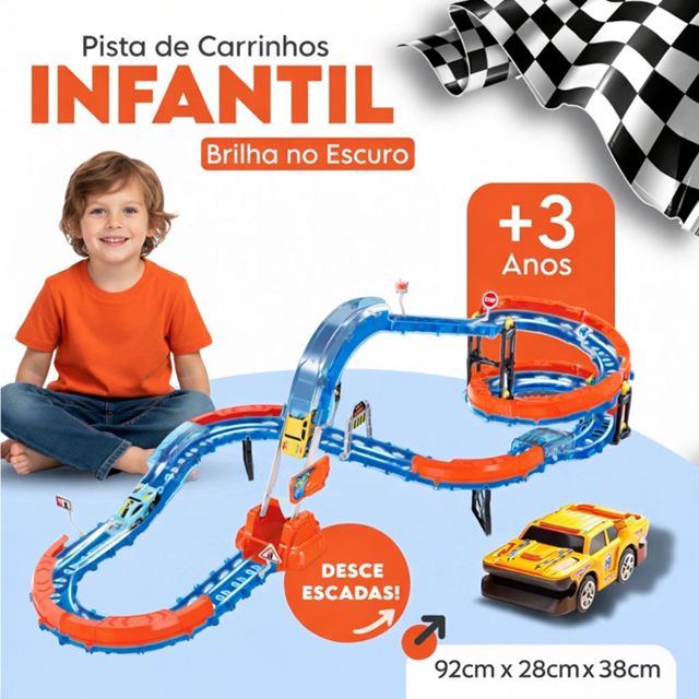 Pista de Carrinhos Infantil que Brilha no Escuro | +3 Anos Diversão garantida para as crianças! A Pista de Carrinhos Infantil que Brilha no Escuro transforma a brincadeira em uma verdadeira aventura, com curvas, escadas e descidas automáticas que encantam os pequenos. Principais Benefícios: - Brilha no escuro - Carrinho recarregável e desce escadas automaticamente - Estimula coordenação motora e criatividade - Design colorido e interativo - Fácil de montar Medidas da Pista Montada: 92 cm (comprimento) 38 cm (largura) 28 cm (altura) O que acompanha: -1 pista de carrinhos - 1 carrinho - 1 Cabo USB - Acessórios Idade Recomendada: A partir de 3 anos Material: - Plástico resistente e seguro para crianças Ideal para presentear em aniversários, Dia das Crianças ou qualquer ocasião especial! Produto novo | Pronta entrega | Envio rápido