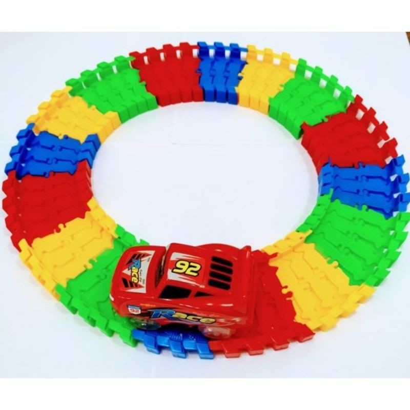 Acompanha 1 Carrinho 1 Pistas com 56 peças ( Aproximadamente 70cm ), largura da pista 6cm externa e onde vai os carrinhos é de 4,5 cm. Uma pista formada por bloquinhos coloridos, onde se encaixam e forma diferentes formatos de pista. Fácil de montar, além de ser um brinquedo de ação e movimento que despertará a criatividade, percepção e agilidade da criança.