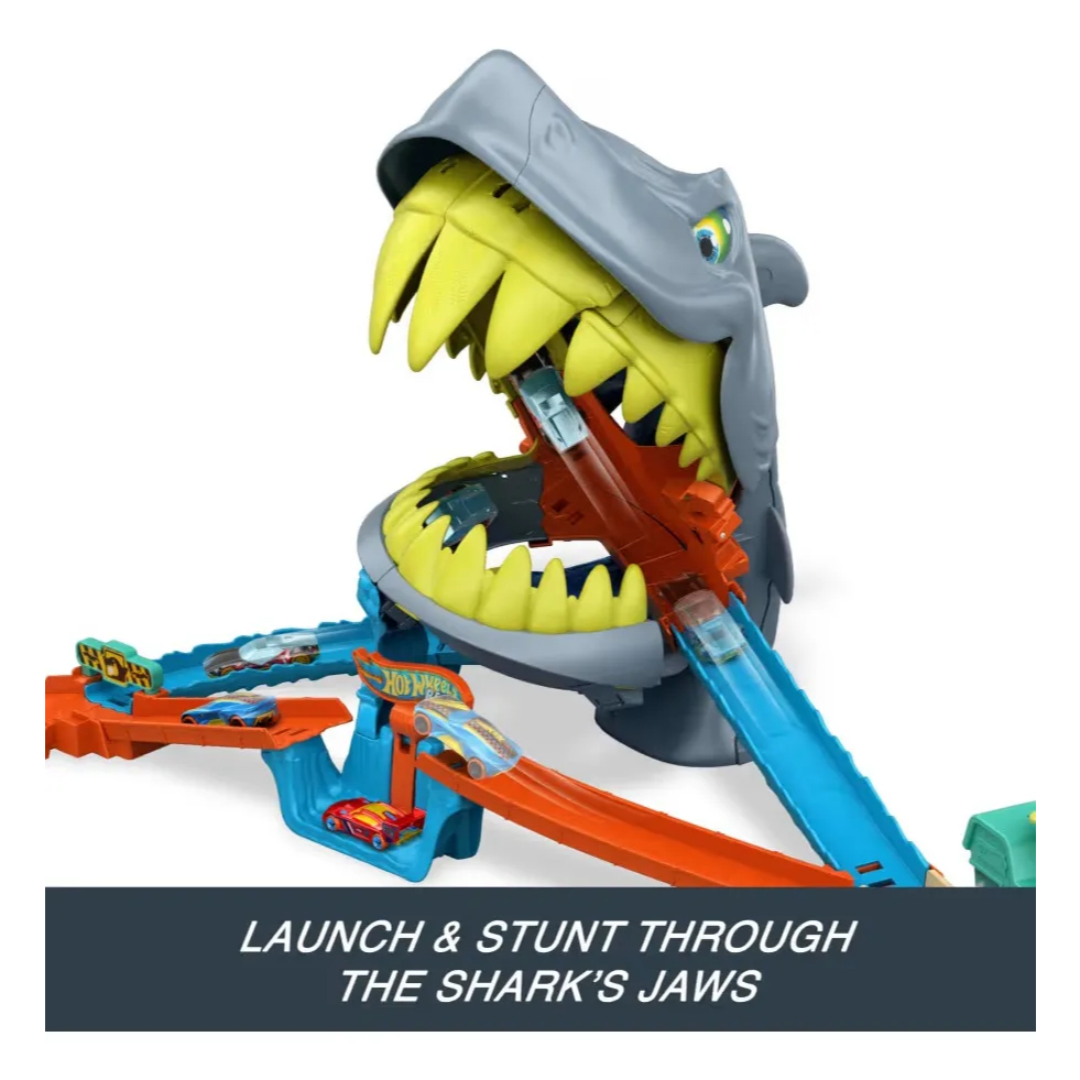 As crianças e seus carrinhos Hot Wheels enfrentam um tubarão faminto no Playset Praia Mordida de Tubarão da Hot Wheels City. Ajuste o lançador giratório para escolher um dos dois caminhos: saltar sobre um vai para evitar o tubarão ou mirar diretamente nele com uma manobra em forma de oito. O truque é lançar os carrinhos com força suficiente para escapar ilesos e nocautear o tubarão. Com uma simples reinicialização, as crianças podem tentar o desafio novamente. O conjunto possui pontos de conexão do Sistema de Pistas Speed Snap para acoplá-lo a outras pistas e conjuntos. (Pistas e conjuntos adicionais vendidos separadamente.) Um carrinho Hot Wheels de metal fundido está incluído. As cores e decorações podem variar. Use suas habilidades de acrobacias épicas para vencer no Playset Praia Mordida de Tubarão da Hot Wheels City. Com um tubarão gigante como inimigo, as crianças lançam seus carrinhos Hot Wheels em sua boca, realizam uma manobra em forma de oito para nocauteá-lo e enviam o herói Hot Wheels para mais aventuras. Há também um desviador de sinal de parada para evitar que os carrinhos saiam em alta velocidade. O tubarão abocanha e devora o carrinho se ele for lançado muito suavemente. Reiniciar é fácil - puxe a cabeça do tubarão para cima ou abra a boca dele para correr novamente! O lançador gira para outra forma de brincar. Lance o carrinho sobre o salto para evitar o tubarão completamente. As crianças podem conectar pistas e conjuntos adicionais com o Sistema de Pistas Speed Snap, projetado para simplificar a montagem, desmontagem e expansão das pistas. (Pistas e conjuntos adicionais vendidos separadamente.)