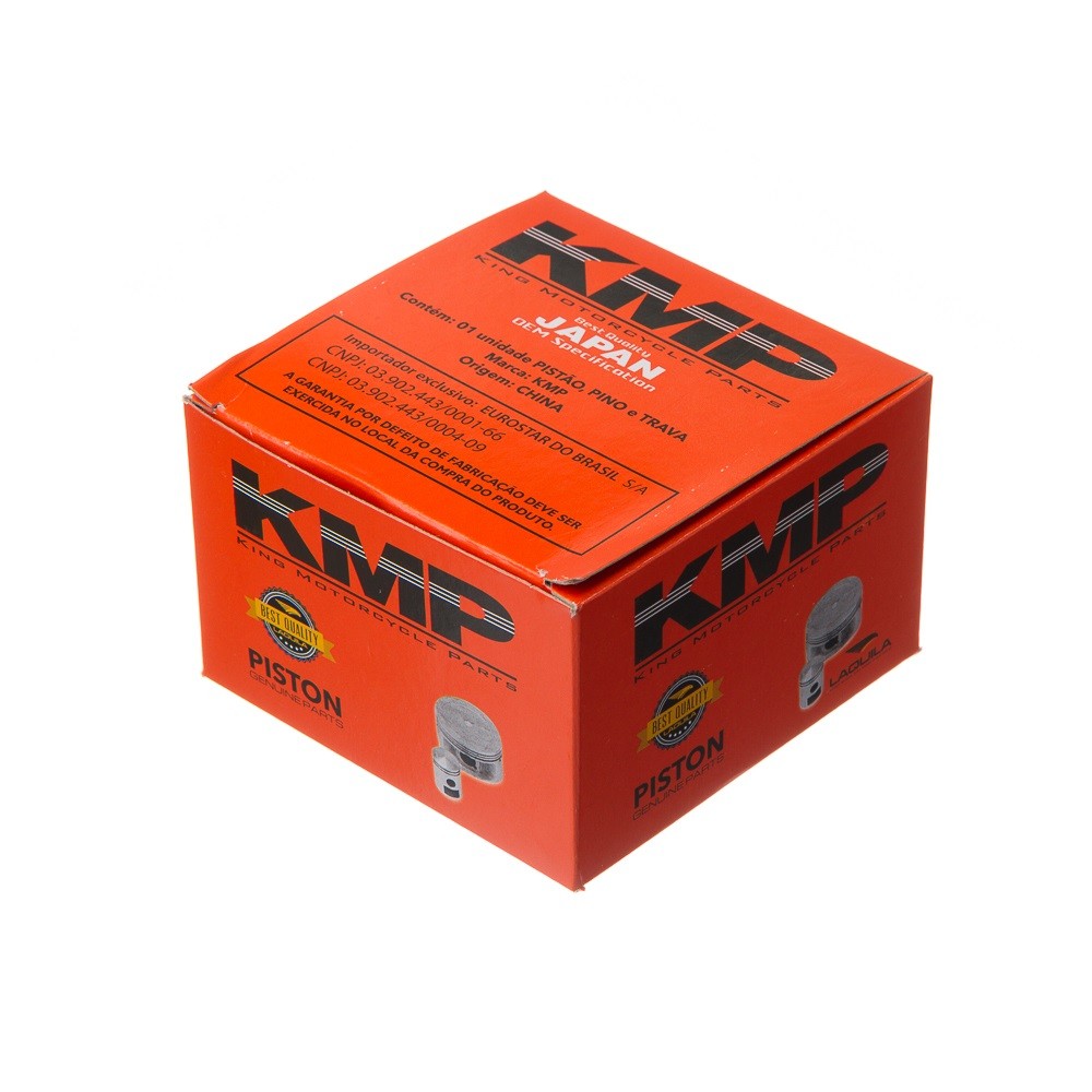 O Pistão Kit com Anel KMP é composto por pistão com pino e travas incluindo Anéis de Segmento KMP. O pistão deste kit foi desenvolvido para utilizar anéis de segmento das CG s de modelos antigos pois as peças eram mais grossas e com isso o motor teria uma vida útil maior. Tudo isso com qualidade e tecnologia moderna da KMP marca líder no mercado. O Pistão KMP é líder de mercado graças à sua qualidade impecável. Esta peça acompanha pino e travas de pistão sendo a escolha perfeita para quem quer deixar o motor dentro das especificações do fabricante já que o produto está em conformidade com todas as especificações OEM (Original Equipment Manufacturer). Além disso o Pistão KMP é fabricado em liga de alumínio especial garantindo funcionamento perfeito em todas as faixas de rotações. O pino de pistão passa por um tratamento de elevação de dureza para garantir ótima performance e as travas que são produzidas em aço carbono recebem tratamentos exclusivos da KMP. Este é um produto que se destaca por ter altíssima qualidade e traz as mais modernas tecnologias em peças para moto. Os Anéis de Pistão KMP são um sucesso no mercado duas rodas por trazerem excelente performance para uma grande variedade de modelos de motos. Para um funcionamento impecável utilize este produto em conjunto com o Pistão KMP dessa forma o conjunto terá excelente rendimento.