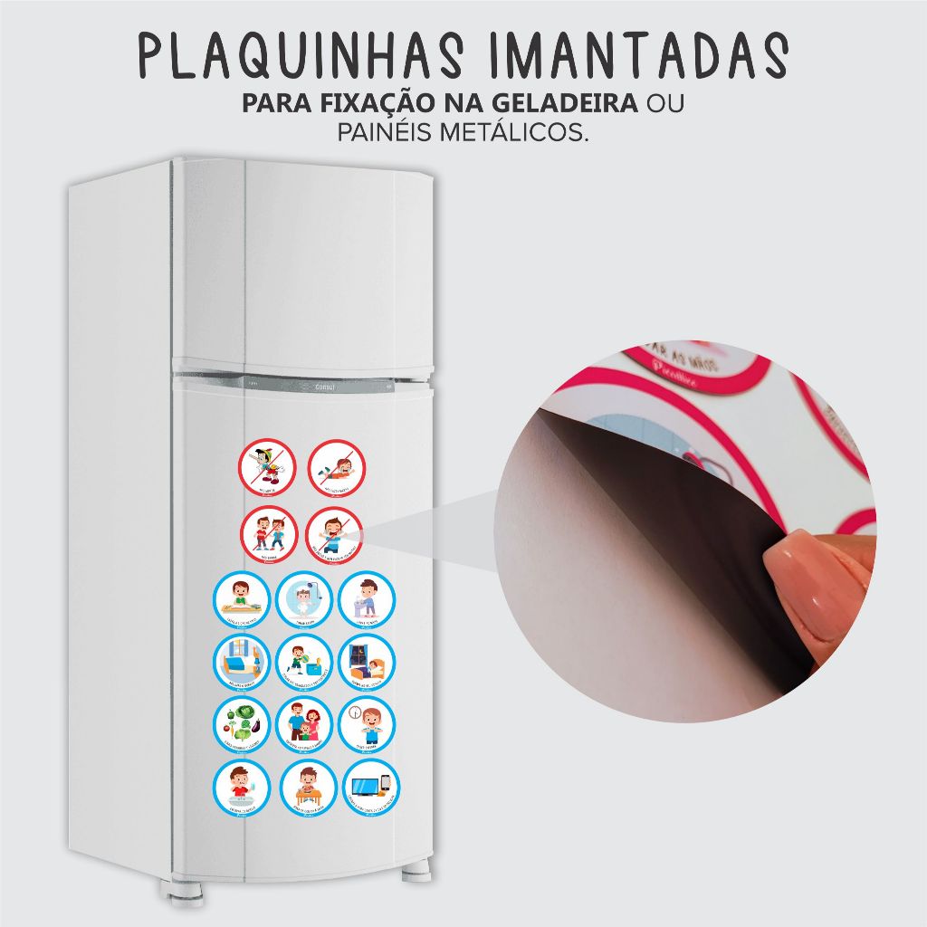 As plaquinhas educativas ajudam as crianças a se organizarem e desenvolverem sua autonomia, incentivando o cumprimento de regras e rotinas diárias. O kit é composto por 16 plaquinhas imantadas tamanho 10x10cm cada, com as seguintes tarefas: Observação: Essas tarefas são padrões e não são personalizáveis, podendo ser escolhido entre as opções para menina, menino • Não mentir • Não brigar • Não gritar e nem chorar sem motivo • Não fazer birras • Escovar os dentes • Fazer a lição de casa • Tomar banho • Lavar as mãos • Hora da comida à mesa • Arrumar o quarto • Cuidar dos brinquedos e dos pertences • Dormir no horário • Esperar a hora certa da tv e do celular • Comer verduras e legumes • Obedecer ao papai e a mamãe • Saber esperar DESCRIÇÃO DO PRODUTO: Construído em base de manta magnética (imã de geladeira), com aplicação de adesivo vinil impressão digital. ONDE FIXAR: Geladeira, painéis metálicos, ou se preferir na parede usando fita dupla face (A fita dupla face não acompanha o produto). DIMENSÃO DO PRODUTO: 10 x 10 cm cada. DÚVIDAS FREQUENTES: Vocês têm uma opção mais em conta? Sim. Temos uma opção somente em adesivo, sem o imã. Onde posso coloca-lo? Em qualquer estrutura metálica, como, geladeira, armários e painéis de chapa metálica.