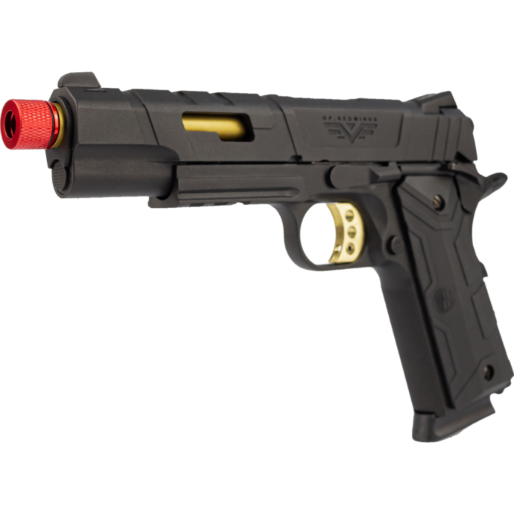 Pistola de Airsoft 1911 Redwings Gold Blowblack Green Gás Hibrida Rossi