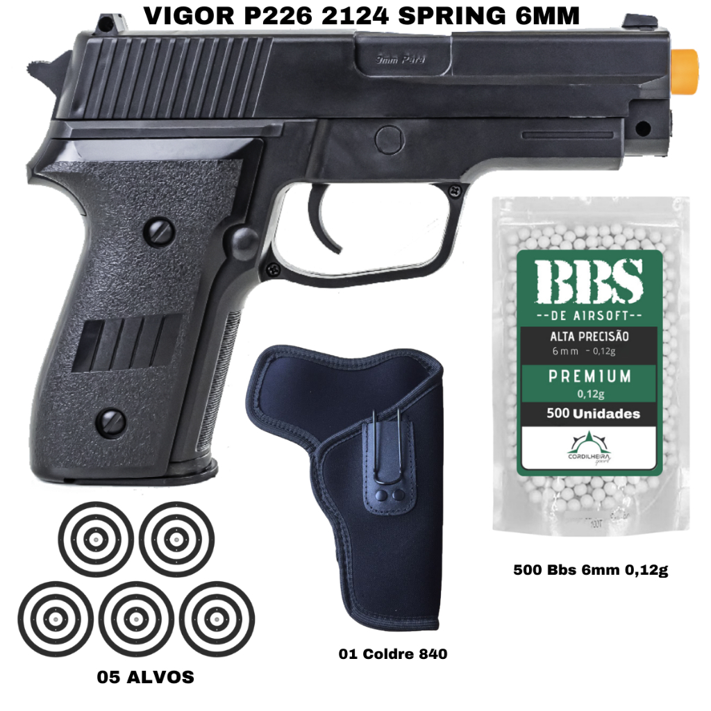 Pistola de Airsoft Spring P226 2124 6mm Rossi Vigor + Acessórios Completo