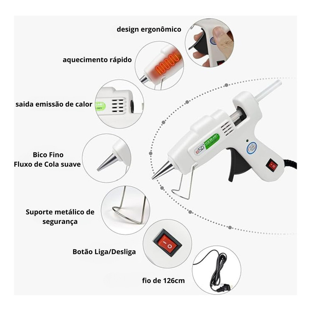 Pistola de Cola Quente Botão Liga e Desliga Bivolt Para Cola Fina 7mm Chinesinha Branca a