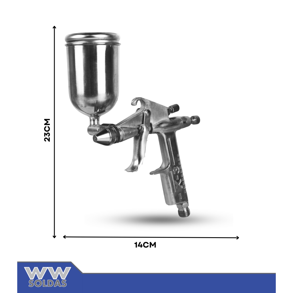 PISTOLA DE PINTURA Modelo: Mini K3 O produto essencial para areografia e pinturas. WWSOLDAS Especificações: - Material: alumínio - Pressão de trabalho: 3,0 - 4 bar / 22 - 60 psi - Largura padrão: 10 cm - Consumo de ar: 35 Litros/Min - Capacidade do copo alumínio: 200 ml - Tamanho bico: 0,5 mm - Entrada de ar: 1/4 (BSP/ nps/ NPT) Rosca Marca: Wwsoldas ******************** * * * * * * * * * * * * * * * ------------------------------------------------ COMERCIAL EDUAR Segunda à Quinta - 8 às 17hrs Sexta - 8 às 16hrs ------------------------------------------------