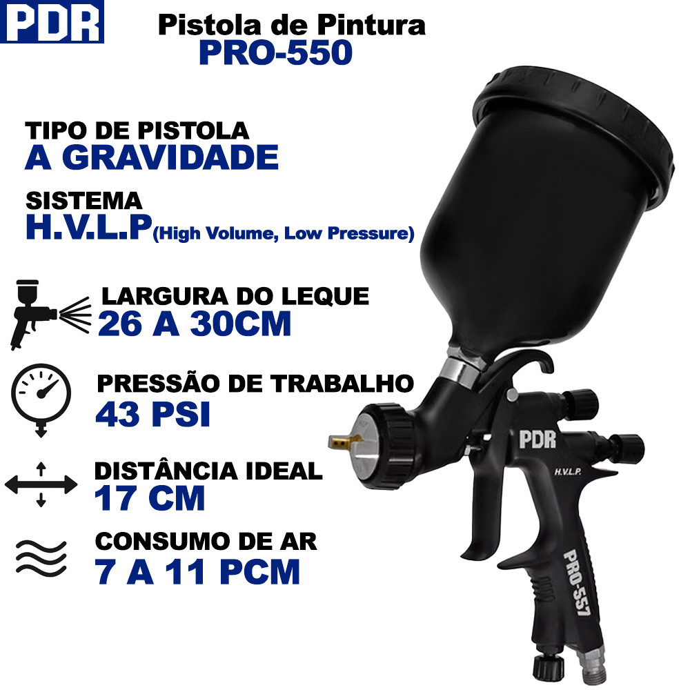 Pistola de Pintura Profissional PDR PRO557 Sistema HVLP Bico de 1.4mm Copo Preto 600ml Proteção UV
