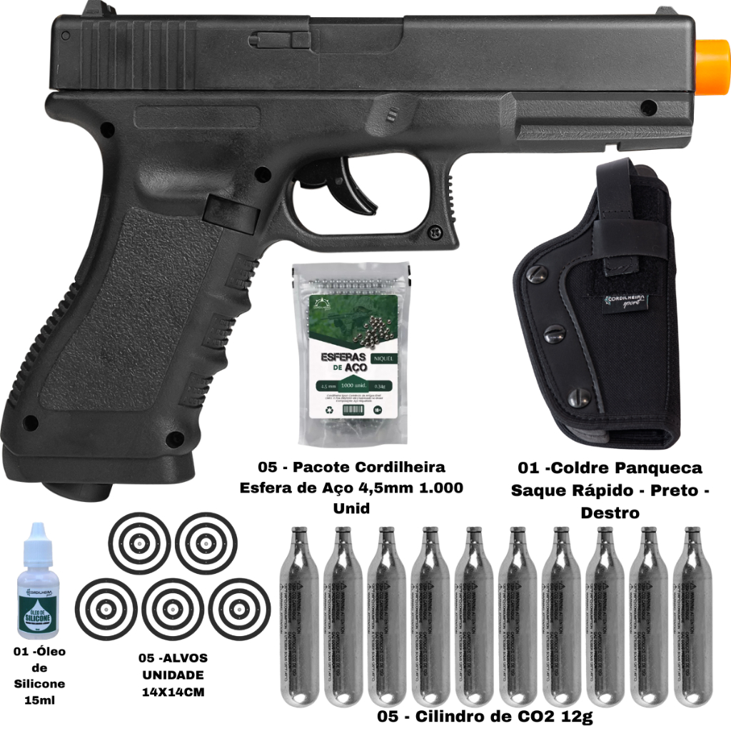 LOJA CORDILHEIRA SPORT! Pistola Rossi G17 CO2 4,5mm + Escolha seu Kit! Descrição: Oferece potência, precisão e realismo para treino e lazer. Fabricada com acabamento robusto, utiliza cápsulas de CO₂ para garantir disparos consistentes e alta velocidade. Seu design ergonômico proporciona excelente pegada, enquanto o sistema sem recuo reduz vibrações e aumenta a precisão. Uma escolha confiável para quem busca desempenho e durabilidade no tiro esportivo. Características: Marca: Rossi Tipo de ação: CO2 Calibre: 4.5mm Modo de Disparo: Repetição Manual Engatilhamento: Ação Dupla Munição utilizada - ESFERA DE AÇO Velocidade máxima (m/s) - 145 M/S Peso munição referência velocidade (g) - 0,34 G Energia (joule) - 3,5 JOULE Peso do produto - 450 G Comprimento do produto - 205 MM Material do produto - POLÍMERO Cano (comprimento) - 128 MM Cano (acabamento) - METAL Capacidade de munição - 18 Trava de segurança - NÃO POSSUI Alça de mira - FIXA Fibra óptica - NÃO POSSUI Massa de mira - FIXA Trilho (tipo) - PICATINNY Trilho (tamanho) - 22 MM Blowback - NÃO POSSUI Ferrolho - FIXO Autonomia de disparos por cápsula de co2 - 100 Velocidade máxima (fps) - 475 FPS Peso munição referência velocidade (grai - 5,24 GRAIN) Indicação de uso - RECREAÇÃO OBS: Para acessar o manual basta acessar o QR CODE na caixa do produto Itens Inclusos: 01 Pistola Rossi G17 CO2 4,5mm 01 Chave Allen Escolha seu KIT: KIT 0: 1.000 Esferas de aço 4,5mm / 05 CO2 / 05 Alvos / 01 Silicone KIT 1: 1.000 Esferas de aço 4,5mm / 10 CO2 / 01 Coldre Panqueca Saque Rápido Preto / 05 Alvos /01 Silicone KIT 2: 1.000 Esferas de aço 4,5mm / 10 CO2 / 01 Maleta /05 Alvos /01 Silicone KIT 3: 1.000 Esferas de aço 4,5mm / 05 CO2 / 01 Maleta / 01 Coldre Panqueca Saque Rápido Preto / 05 Alvos / 01 Silicone Garantia: 3 Meses pelo Fabricante. NÃO NECESSITA CR PARA COMPRA! ATENÇÃO!!! O USO DO PRODUTO EXIGE TREINAMENTO E EQUILÍBRIO EMOCIONAL. DEVERÁ SER GUARDADO EM LUGAR SEGURO E FORA DO ALCANCE DE TERCEIROS. Importante: Estes produtos não necessitam de guia de tráfego para transporte e deslocamento. O Transporte do equipamento deve ser feito dentro da caixa /maleta/ Case, deve estar desmuniciado e com a nota fiscal. Produto destinado para maiores de 18 anos Todos os produtos anunciados estão em estoque a pronta entrega. Só comercializamos produtos NOVOS e com NOTA FISCAL em nome do comprador e com garantia. Prezamos muito o nosso comprometimento com o cliente, todas as perguntas são respondidas o mais rápido possível. COMPRANDO MAIS ITENS DA LOJA VOCÊ TEM DESCONTO NO FRETE!!! VER TODOS OS PRODUTOS DA LOJA EM: “VER MAIS ANÚNCIOS DO VENDEDOR” OU “PERFIL DA LOJA”