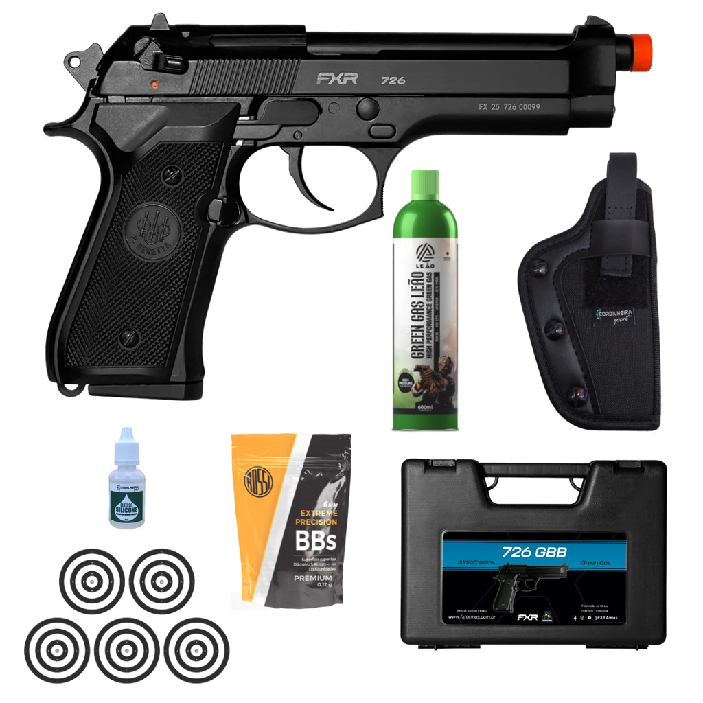 Pistola FULL Metal 6mm Airsoft Green Gás FXR Double Bell M92 726 6mm + Escolha seu KIT: