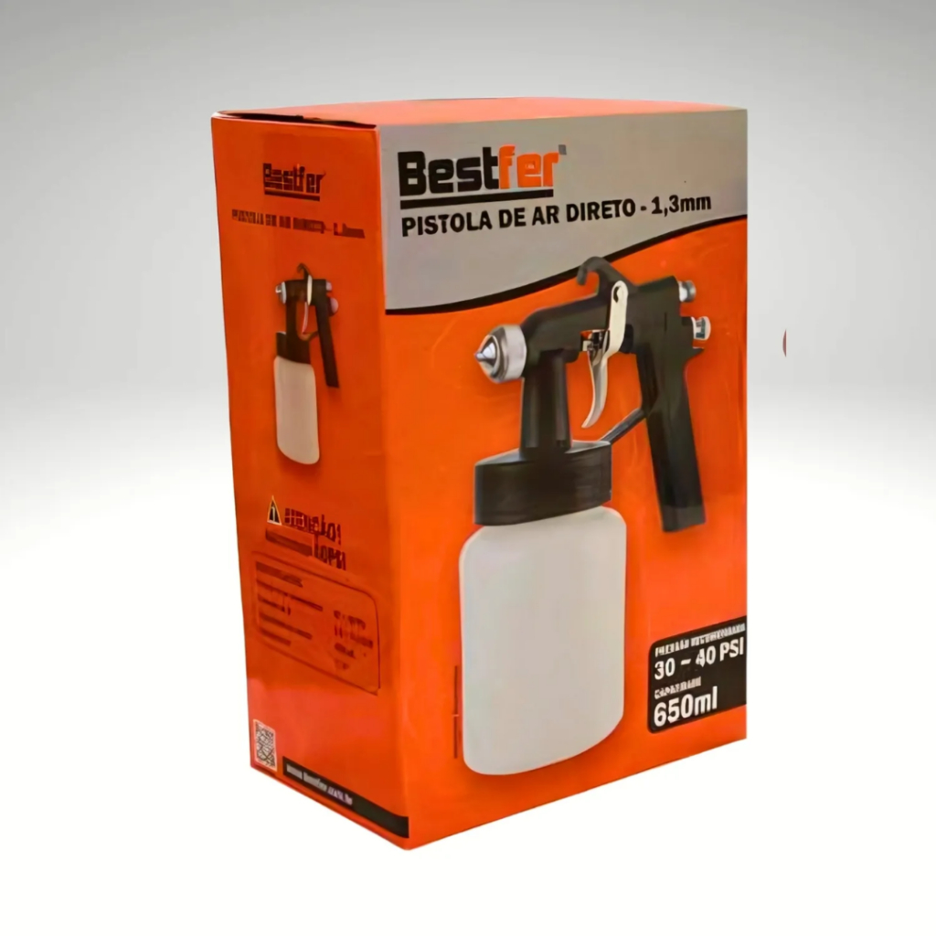 DISTRIBUÍDO POR CJAU FERRAMENTAS PISTOLA DE PINTURA AR DIRETO BFH2633 BESTFER Alta eficiência, economia de tinta e acabamento profissional Ideal para quem busca praticidade e ótimo desempenho na pintura de superfícies, a Pistola de Ar Direto Bestfer é equipada com bico de 1,3 mm, que proporciona uma aspersão uniforme, cobrindo grandes áreas com rapidez e precisão. Seu sistema de alimentação por gravidade e o reservatório de 650 ml tornam esta ferramenta perfeita para pintura de paredes, cercas, móveis, e até mesmo retoques em veículos. Indicada, principalmente, para ambientes prediais (pinturas com tinta óleo, verniz para madeira, esmalte sintético e selador) e ramo serralheiro (aplicação de zarcão, esmalte sintético, tinta automotiva, fundos diversos, tinta óleo e tinta martelada). Pode ainda ser utilizada, com restrições, no ramo moveleiro para aplicação de seladores, vernizes, pesticidas e fundos. Benefícios e Vantagens: - Aspersão uniforme com menor consumo de tinta - Otimiza tempo e esforço em aplicações domésticas ou automotivas - Fácil de manusear e compatível com compressores de ar direto - Ideal para pintura de superfícies médias e grandes. Especificações Técnicas: - Capacidade da caneca: 650 ml - Diâmetro do bico: 1,3 mm - Pressão de trabalho: 30 a 40 PSI ( 40 Lbs ). - Consumo de ar: 3.0 a 4.5 CFM - Entrada de ar: 1/4 - Composição: Plástico, ferro, zinco e nylon - ATENÇÃO NÃO EXCEDER 40 PSI Na loja C-JAÚ, você encontra sempre as melhores ferramentas e acessórios para elevar o padrão do seu trabalho, com qualidade, tecnologia e confiança. E o melhor: tudo isso com atendimento especializado e envio rápido para todo o Brasil. Aproveite!
