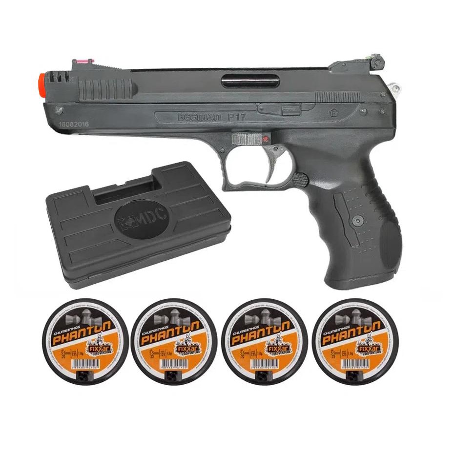 A Pistola de pressão da Beeman calibre 5,5mm, impressiona desde o primeiro momento pela semelhança com uma pistola de fogo e ptencia de disparo. Além disso, possui excelente custo-benefício, empunhadura muito confortável, peso balanceado, é silenciosa e precisa. Principais características: Modelo: Pistola de Pressão 2004 P-17 5,5 Marca: Beeman Arma de ação por bombeamento. Monotiro. Alça de mira com regulagem vertical e horizontal. Massa de mira fixa. Trava de segurança automática e manual. Trilho (11 mm) para fixação de lunetas e miras óticas. Calibre: 5,5 mm Coronha: Polímero Preto (muito resistente) Acabamento: Oxidado Cano: 160 mm Comprimento: 230 mm Peso: 780 g Velocidade: 100 m/s (velocidade maxima pode variar de acordo com a munição utilizada) Possui trilho para fixação de lunetas e miras ópticas (11 mm) Acompanha: Capa especial ou case (conforme estoque), 04 latas de chumbinho, Manual e nota fiscal ATENÇÃO: Nos combos que acompanham capa, esta não comporta a luneta acoplada à carabina, somente desmontadas.