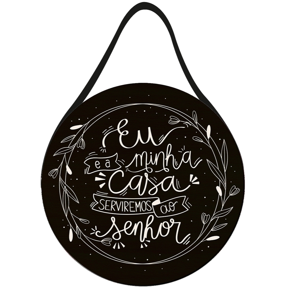 Placa com Alça de Couro Redonda Eu e Minha Casa Serviremos ao Senhor 20x20cm