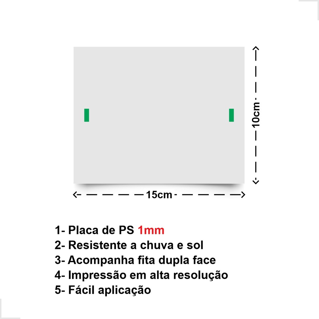 Placa Personalizada Número de Casa 10x15cm em PS 1mm Quer deixar a frente da sua casa mais bonita e organizada? Com a nossa Placa Personalizada de Número Residencial, você garante um visual moderno, resistente e fácil de aplicar. Fabricada com material de alta qualidade, essa placa é ideal para identificar o número da sua casa com estilo e durabilidade. ESPECIFICAÇÕES Tamanho: 10x15cm (largura x altura). Material: Adesivo Vinil impresso frente aplicado em Poliestireno (PS 1mm). Conteúdo da embalagem: 1 Placa Personalizada + 1 conjunto de fita Dupla Face para Fixação. VANTAGENS Fácil Aplicação: Acompanha fita dupla face, podendo ser aplicada em diversas superfícies lisas. Durabilidade e resistência garantidas. Acabamento profissional e visual elegante. Resistente à água e ao sol, ideal para uso externo. DÚVIDAS FREQUENTES O MATERIAL É RESISTENTE? – Sim, o PS de 1mm é firme e durável. POSSO PERSONALIZAR COM QUALQUER NÚMERO? – Sim, basta informar o número desejado no campo de personalização ou no chat. PODE SER USADA NA ÁREA EXTERNA? – Sim, o material é resistente à chuva e ao sol. A FIXAÇÃO É FÁCIL? – Sim, acompanha fita dupla face de alta aderência para facilitar a aplicação. TEM OUTROS TAMANHOS? – Sim, trabalhamos com diversos modelos e medidas. Fabricação Própria, Especializada em Placas e Adesivos.