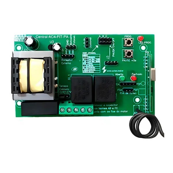 Central Para Motor AC4 Fit PA Acton - CENTRAL SEM FREIO E RAMPA - BÁSICA ! LEIAM ATENTAMENTE O ANÚNCIO ANTES DE FINALIZAR A COMPRA ! NÃO TEM BORNER PARA CAPACITOR, O FIO DO CAPACITOR É JUNTO COM O FIO DO MOTOR !!! Sua central para automatizadores possui as seguintes características: Automatizadores ate 1/3cv em 127V ou 1/2cv em 220V; Programacao por botoes; Até 768 botões de controles remotos code learning/rolling code; Alimentação por transformador de 80mA bivolt 127V/220V, selecionado por strap; Tempo de abertura/fechamento cadastrado de modo automático; Entrada para botoeira de abertura e fechamento; Entrada para fotocélula ou laço indutivo; Saída para 1 módulo opcional relé Acton com função programável; Entrada para receptor externo; Saída 3 pinos e 5 pinos para fim-de-curso; Leds indicativos de m-de-curso de abertura e fechamento; Módulo receptor incorporado a placa; Aplicação As centrais desta linha destinam-se a automatizadores monofásicos de até 1/3CV. É a linha de mais baixo custo e de instalação mais simples, entretanto possui uma alta robustez e qualidade garantida Acton. É montada em processo robotizado e seu processador CISC de alto desempenho garante um funcionamento seguro a seu automatizador. Se estiver em dúvidas sobre o modelo a ser utilizado em sua residência, conte com nosso departamento comercial para esclarecimentos e ponto de venda mais próximo. Funções: • Central exclusiva para aplicação em motores deslizantes; Observações: • Manual disponível em QR Code