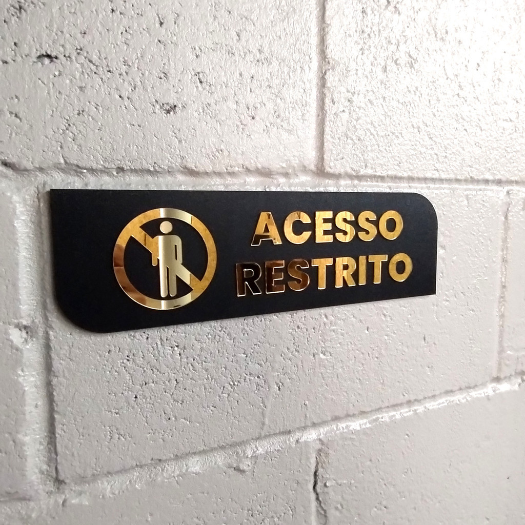 Placa de Sinalização Acesso Restrito em MDF e Acrílico espelhado Dourado