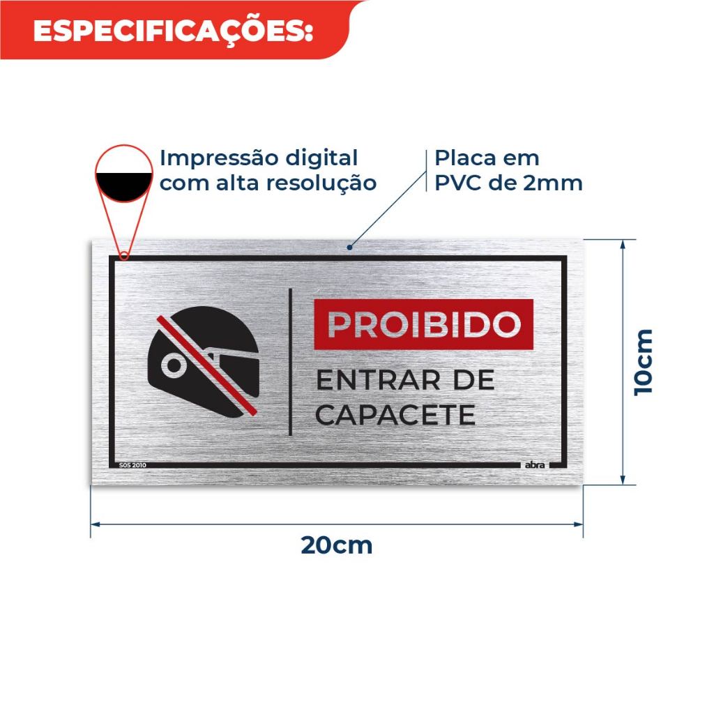 Placa de Sinalização Proibido Entrar de Capacete 20x10 cm Placa com Adesivo de Aço Escovado Loja Comércio Restaurante Seja bem vindo a nossa loja Abra Decor, empresa especializada em soluções para sinalização, segurança e decoração de ambientes. • Fabricação própria; • Material: Adesivo vinil aço escovado com impressão digital em alta resolução aplicado sobre PVC 2mm; • Impressão eco solvente; • Alta durabilidade; • Formato: 20x10 cm; • Fácil instalação e manuseio: Acompanha fita dupla face no verso para fixação; • A limpeza pode ser realizada com um pano macio seco ou úmido. Não utilize produtos químicos, pois podem danificar a placa. Sugestão de instalação: Realize a limpeza da superfície com pano seco ou úmido para retirar impurezas e oleosidade. Remova a proteção da fita adesiva dupla face e pressione a placa contra a superfície a ser aplicada por 10 segundos para haver a fixação ideal.