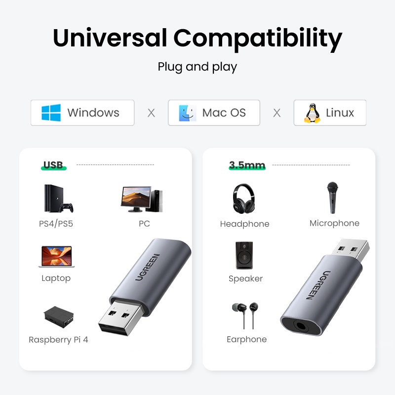Placa De Som Ugreen 2 Em 1 USB Interface De Áudio Externa 3.5mm Adaptador De Para PC Portátil PS4 Fone De Ouvido