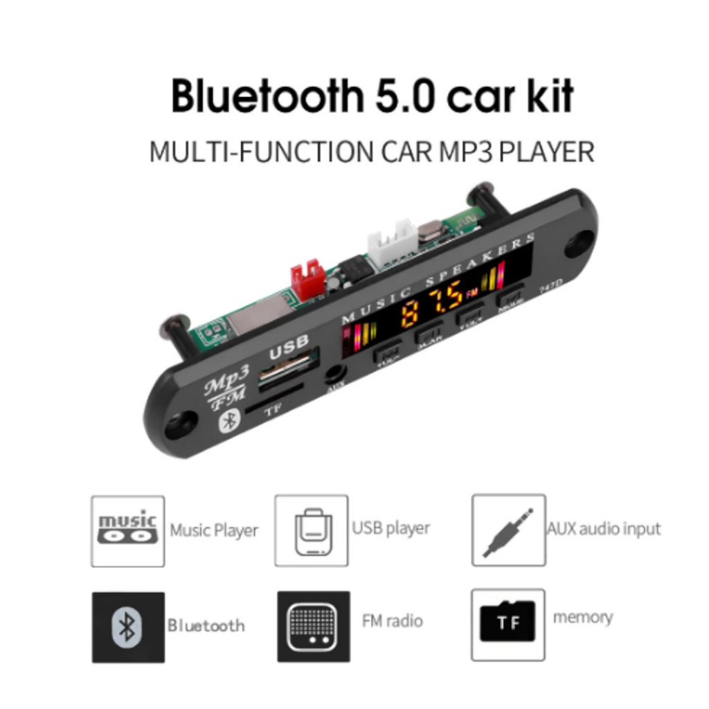 Placa Decodificadora Sem Fio Bluetooth 5.0 DC 12V MP3 WMA Módulo De Áudio USB TF Rádio Com o módulo receptor de áudio bluetooth, você pode ouvir suas músicas utilizando o celular via bluetooh passando para o módulo e uma caixa de som amplificada. Pode-se utilizar também a entrada USB, cartão, auxiliar... Atenção: a placa não é amplificada Tensão de alimentação: DC12V; Consumo de energia do produto: Abaixo de 200MA Chip de controle principal: JL AC6926A4 Versão Bluetooth: 4.2 Nome do Bluetooth: BT_SPEAKER Distância de transmissão Bluetooth: Mais de 10 metros Suporta formato de música: MP3/WMA/WAV/FLAC/APE Frequência de áudio FM: 87,5—108,0 MHZ Tamanho do painel: 107 * 25,5 MM Recepção de infravermelho: valor do código de controle remoto 00FF TF: cartão de memória TF (32GB); TELA: Visor digital AUX: interface de entrada de áudio USB: disco U (32GB); VOL-: Pressione a música anterior no estado USB / TF / BLUE; pressione a estação anterior no estado FM, pressione e segure o volume. SCAN: Pressione play / pause em USB / TF / BLUE e pressione a estação de varredura automática em FM VOL+:Pressione a próxima música em USB/SD/AZUL; pressione a próxima estação em FM, pressione o volume; MODO: Com cartão TF e disco U: a ordem do switch é TFUSBAUXFMBLUE; apenas disco U: a ordem do switch é UBA UX FMBLUE; apenas cartão TF: a ordem de comutação é TFAUX FMBLUE. Decodificador Bluetooth MP3