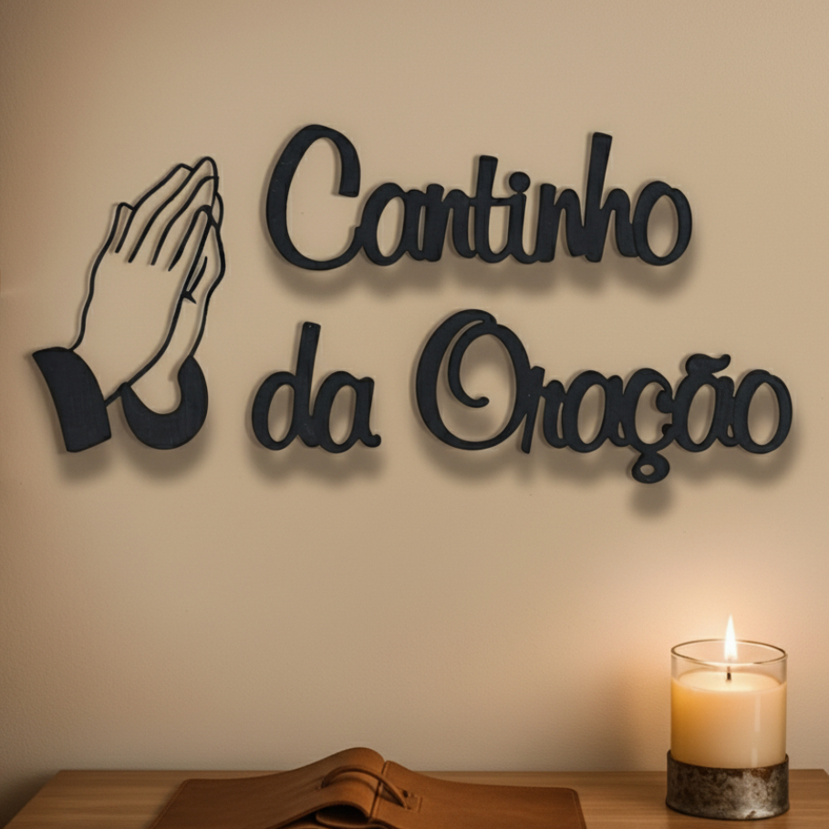 Placa Decorativa Cantinho da Oração Quadro Religioso Decoração Parede MDF Vazado Preto + Fita 3M