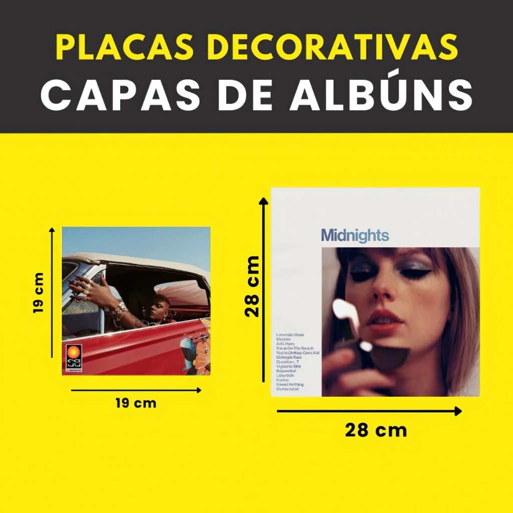 COMO COMPRAR? 1° Selecione o tamanho desejado 2° Adicione o produto ao carrinho 3° Após efetuar sua compra nos envie uma mensagem com o nome da capa do album que você deseja: Ex: Taylor Swift - The Tortured Poets Department Standard E pronto! Seu pedido será produzido. Em caso de dúvidas, entre em contato com o nosso canal de atendimento. Tamanhos: * 19x19cm; * 28x28cm. * Especificações e Avisos Importantes: - Antes de efetuar a compra, tire todas as duvidas pelo chat; - Atenção às medidas, imagem de capa meramente ilustrativa; - Estrutura em MDF 3mm de espessura; - Impressão em adesivo com qualidade fotográfica de alta resistência; - Laminação feita com vinil brilhoso aumentando a durabilidade; - Acabamento em bordas infinitas (continuas); - Placas para decoração INTERNA. Evitar contato direto com a luz solar e umidade; - Todos os quadros acompanham fita dupla face para fixação; * EM CASO DE QUADRO DANIFICADO OU COM DEFEITO. - Pedimos encarecidamente que antes de abrir reclamação no, nos contate pelo chat, pois a reclamação uma vez aberta prejudica e muito o vendedor, tentaremos resolver da melhor forma possível e rápida. Qualquer dúvida, estaremos sempre a sua disposição.