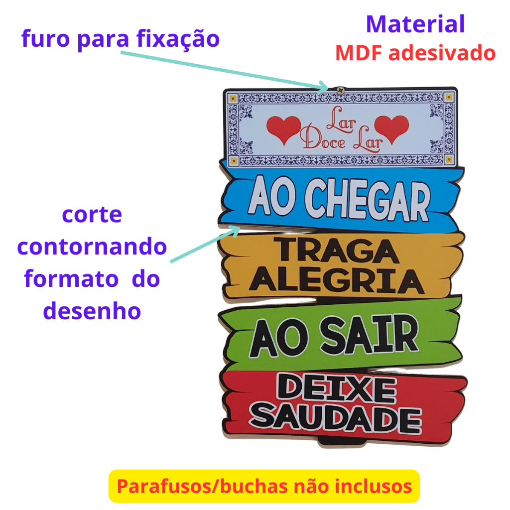 Deixe seu ambiente mais elegante com uma placa moderna, bem humorada e colorida que certamente trará mais alegria ao seu dia a dia. Placa feita de MDF cortado a laser e adesivada Recomendada para pendurar na parede Medidas: Largura: 21 cm Altura: 30 cm Espessura do MDF: 3 mm Peso: 140 g Acabamento: adesivado Tema: "Lar doce lar. Ao chegar traga alegria. Ao sair deixe saudade" Para fixar: Necessário 1 parafuso/bucha (não inclusos)