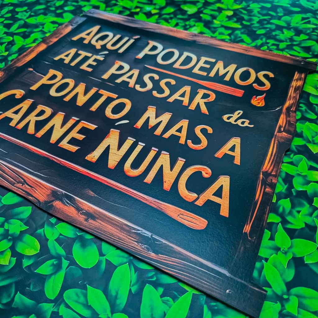 Placa Decorativa MDF Churrasco – "Aqui Podemos Até Passar do Ponto, Mas a Carne Nunca"
