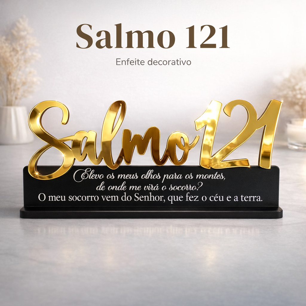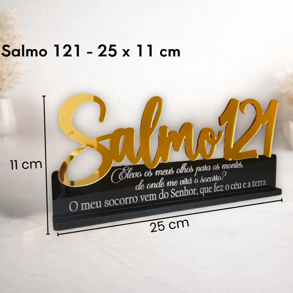Transforme a decoração com uma mensagem de fé e proteção! O Salmo 121 é perfeito para quem deseja um toque religioso elegante em casa, escritório, igreja ou presente especial. ✅ Destaques ✨ Modelo Salmo 121 (conforme fotos) 🟡 Detalhe em Acrílico Dourado Espelhado 🖤 Base preta com escrita (conforme fotos) 🎁 Ótimo para presentear em datas especiais 🏠 Ideal para mesa, aparador, estante e nichos 📏 Medidas Altura: 11 cm Comprimento: 25 cm 📦 O que você recebe 01 Placa Decorativa Salmo 121 (mesmo padrão dos demais salmos) 💡 Dica de uso Combine com uma decoração clean (tons neutros) para o dourado espelhado ficar ainda mais destacado.