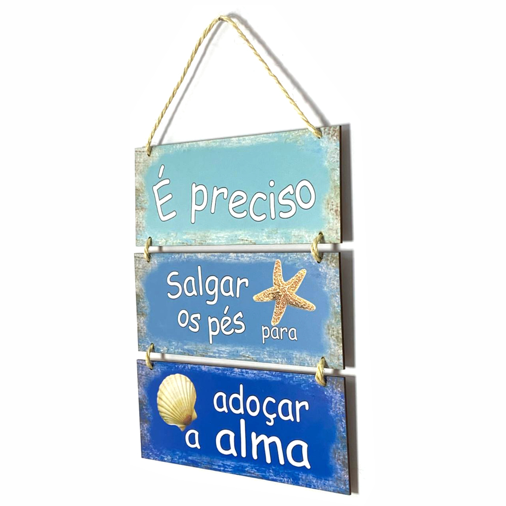 Placa Decorativa Suspensa em MDF com Corda de Sisal Frase É Preciso Salgar os Pés Parede 3 Partes