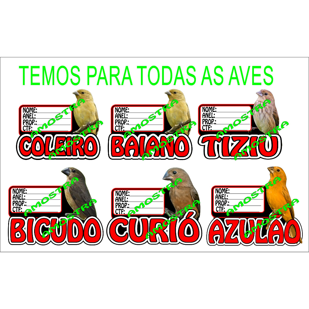 PLACA GAIOLA PASSARO TODAS ESPECIES TRINCA FERRO COLEIRO BAIANO AZULAO TIZIU CANARIO BICUDO CURIO CORRUPIÃO CARDEAL