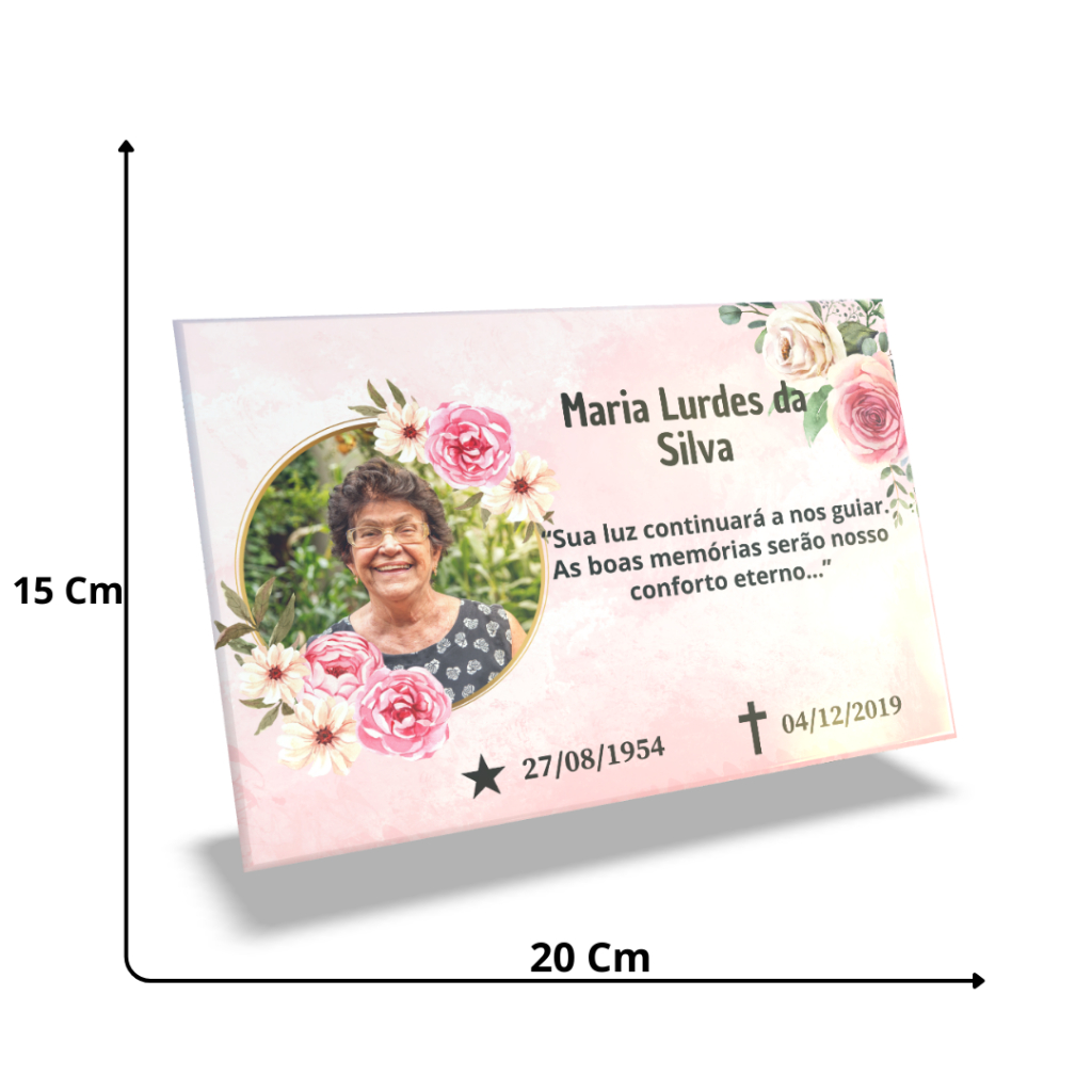 Que tal fazer uma placa para seu ente querido, com um custo bem mais acessível que as placas tradicionais de bronze? 1 Azulejo de Cerâmica Personalizado. - Tamanho: A escolher. ( 15x20) (20x30) Estampa realizada em sublimação com excelente qualidade. PRAZOS: Prazo de produção e envio: 7 dias uteis. O prazo provável de recebimento do produto aparece no seu app da Shopee, no carrinho de compras. ATENÇÃO: * Selecione o tamanho e modelo desejado no anuncio, Logo após a compra, nos envie pelo chat ( Fotos de boa qualidade, Nomes completos e datas) * NÃO EDITAMOS A FOTO DA PESSOA. ESTE É UM PRODUTO PERSONALIZADO, FEITO EXCLUSIVAMENTE PARA VOCÊ. PODEM HAVER VARIAÇÕES DE CORES DA TELA DO COMPUTADOR/CELULAR PARA A ESTAMPA. **** Este produto pode sofrer alteração de cor quando exposto ao sol ao chuva por longos períodos. Estima-se que a durabilidade das peças nesta condição seja de no mínimo 1 ano e de mais de 1 ano quando preservada longe das mudanças climáticas citadas. Para maior durabilidade pode ser aplicado verniz PU automotivo com proteção UV.
