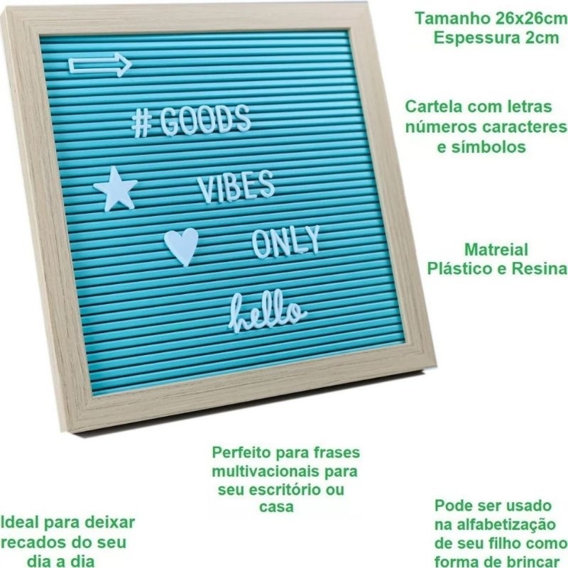 Adicione um toque de estilo e sofisticação ao seu ambiente com este quadro decorativo único! Com um design minimalista e moderno, o quadro apresenta letras, números e símbolos em um elegante tom preto, perfeito para combinar com qualquer decoração. Detalhes do produto: - Dimensões: altura: 26cm, largura 26cm. - Material: plástico e resina. - Cor: Verde Itens inclusos: 1 quadro verde, 1 prendedor (para pendurar o quadro na parede, se desejar) e 2 cartelas com 240 caracteres (letras, números e símbolos). Ideal para salas de estar, escritórios, quartos ou qualquer espaço que precise de um toque de personalidade. Não perca a oportunidade de adquirir esta peça exclusiva para transformar seu ambiente!